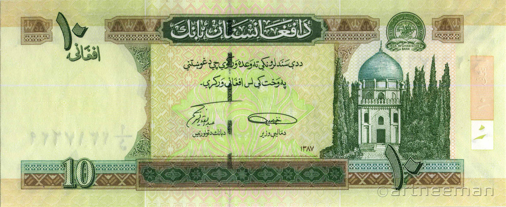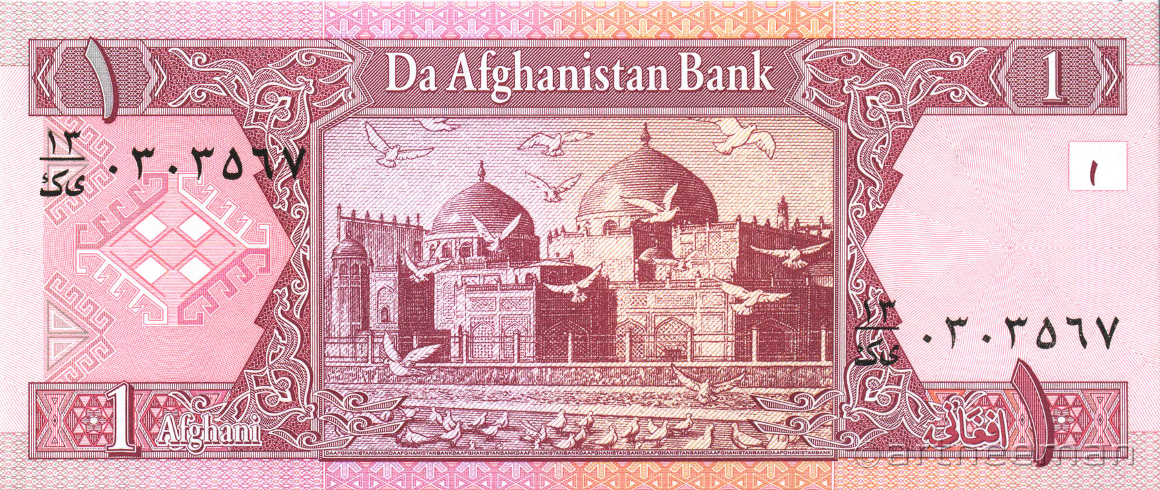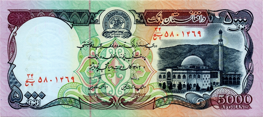 Лицевая сторона: Эмблема Центрального банка Афганистана, мечеть Пул-е Хишти — самая большая мечеть в Кабуле, Афганистан. Расположена в центре старого Кабула, легко узнаваема благодаря её большому синему куполу.