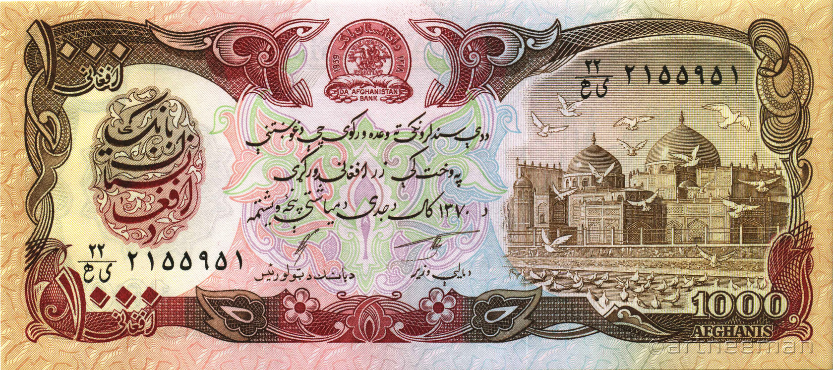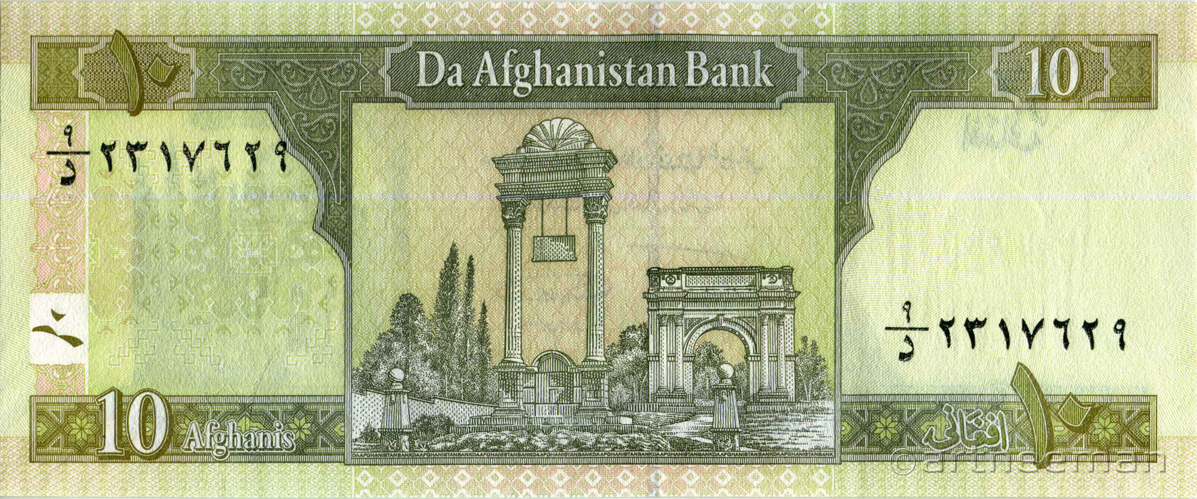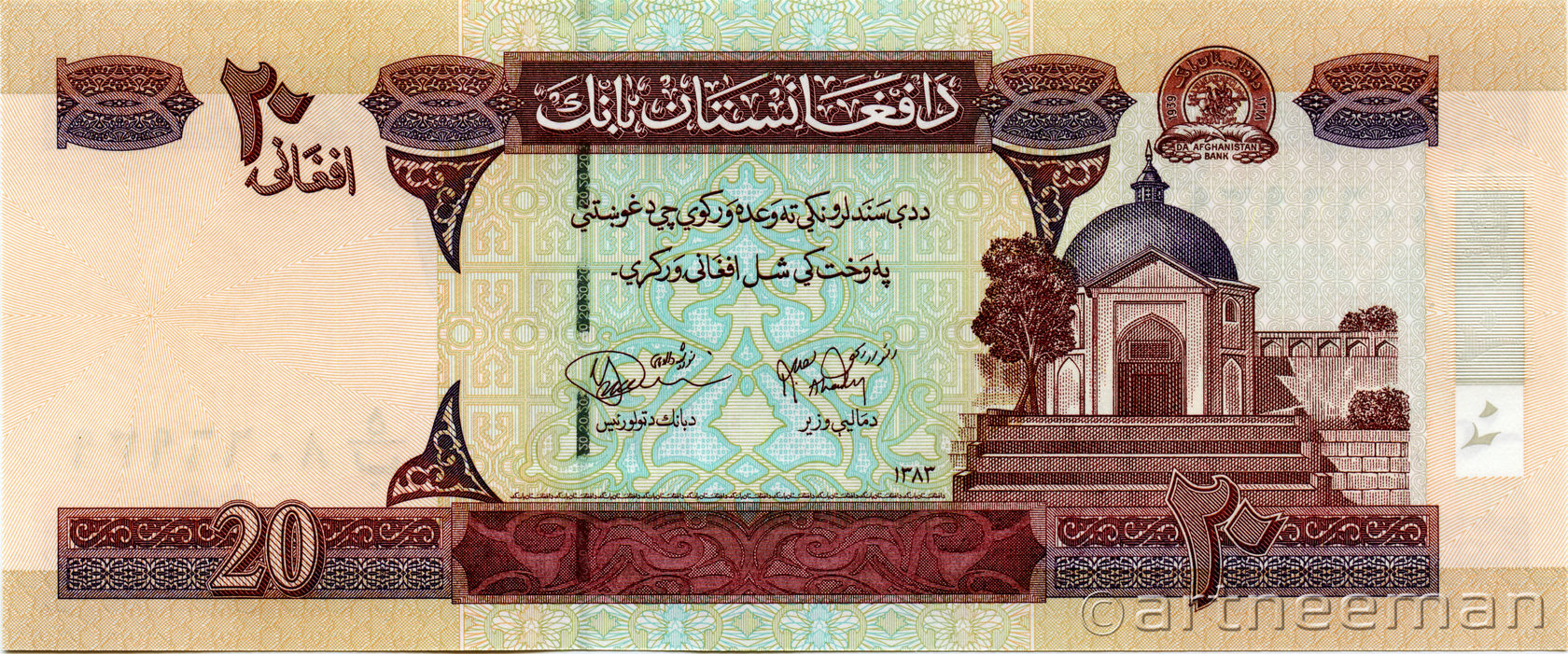 Лицевая сторона: Эмблема Центрального банка Афганистана, мечеть Пул-е Хишти — самая большая мечеть в Кабуле, Афганистан. Расположена в центре старого Кабула, легко узнаваема благодаря её большому синему куполу.