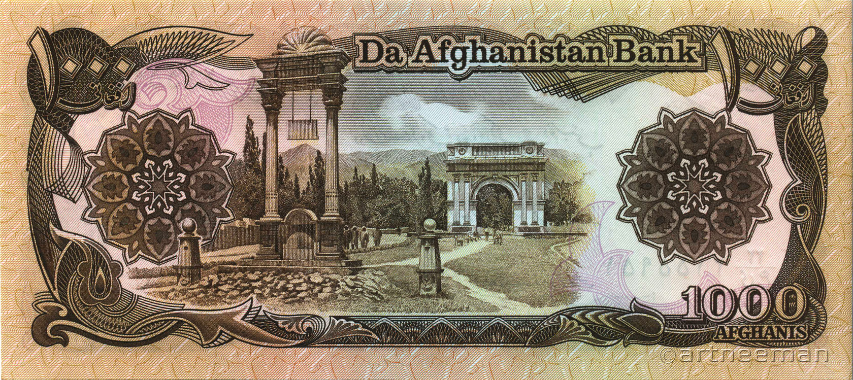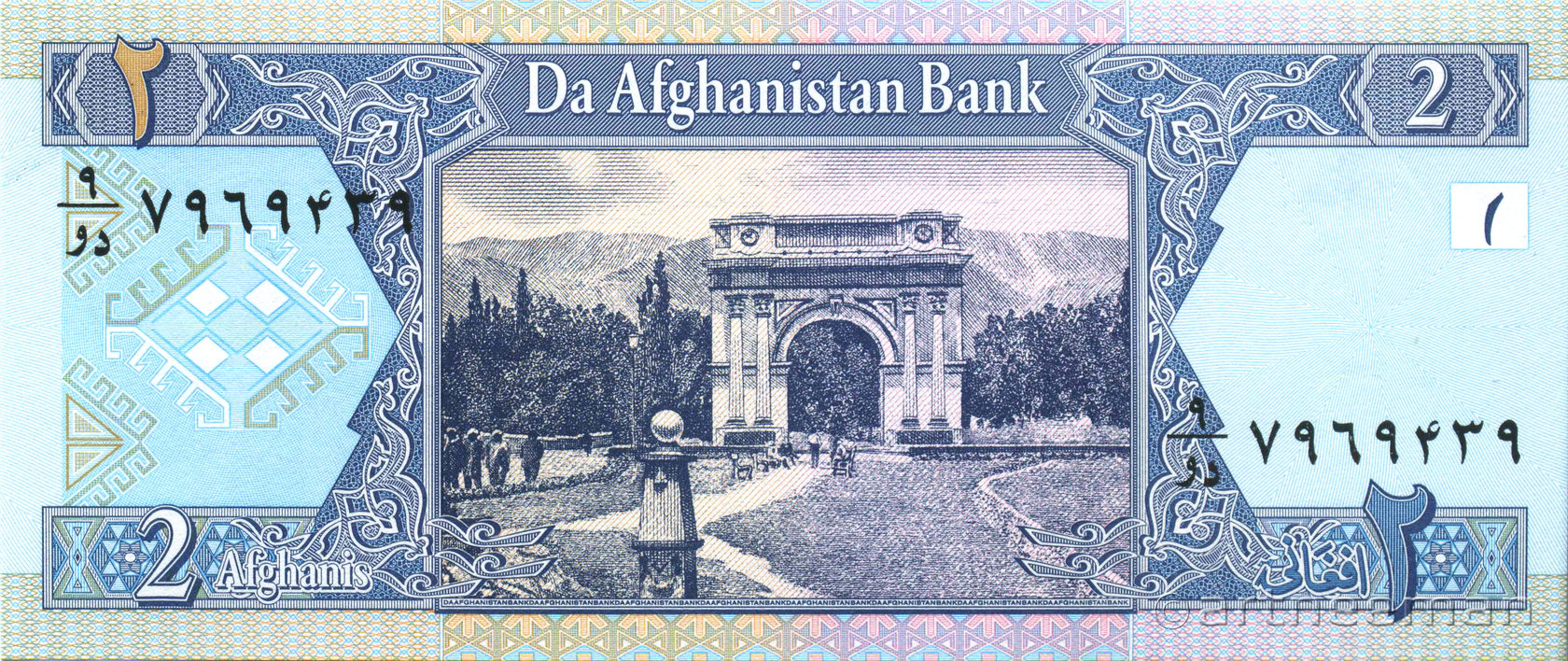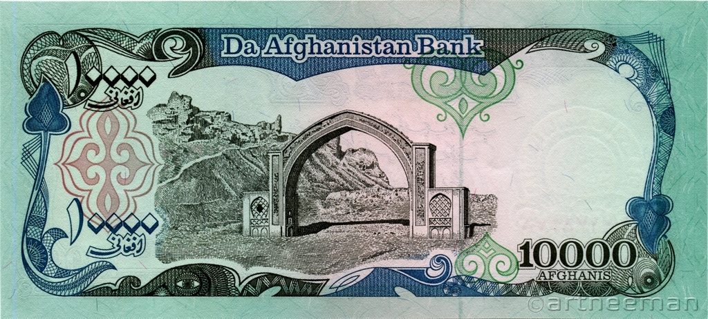 Оборотная сторона: Изображение Триумфальной Арки "Такия Зафар". Триумфальная Арка "Такия Зафар" в Пагмане (пригороде Кабула) - была сооружена в честь победы Афганистана над Великобританией в Третьей Англо-Афганской войне, результатом которой стало признание независимости Афганистана