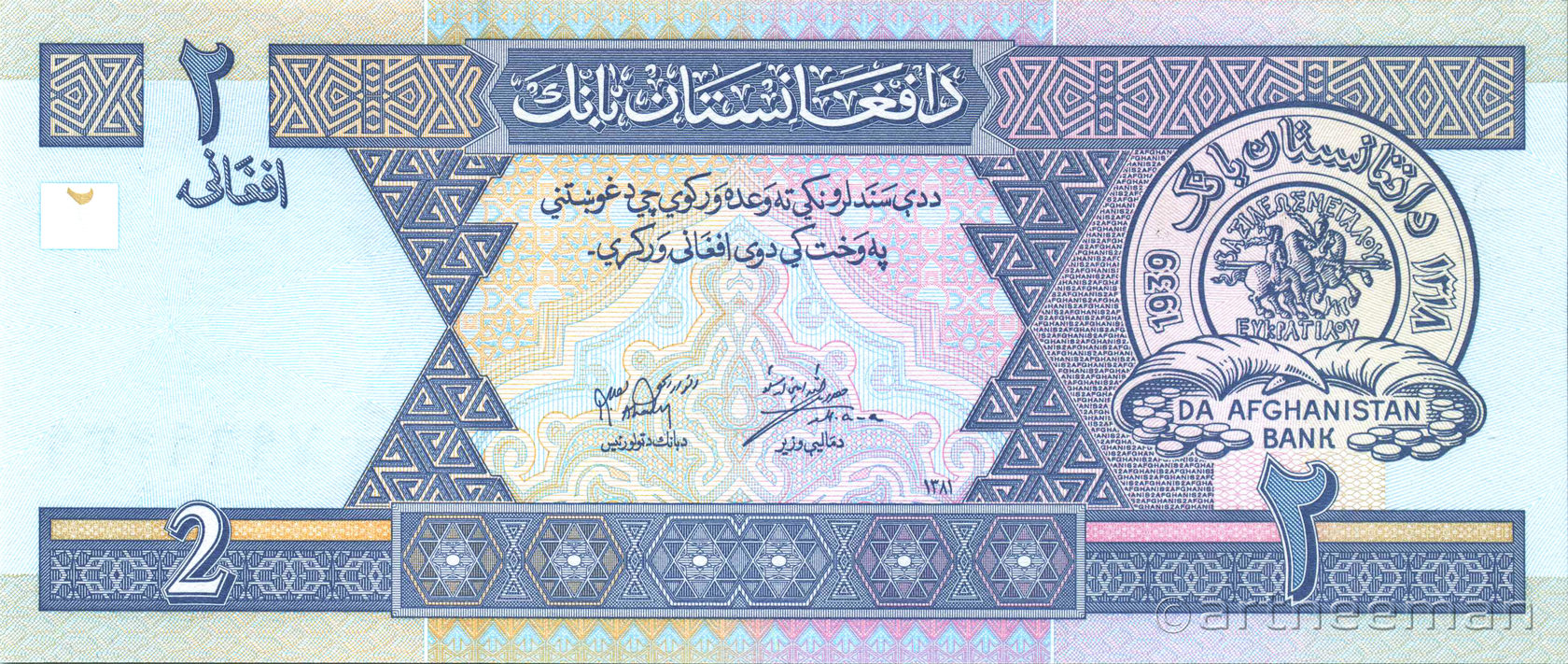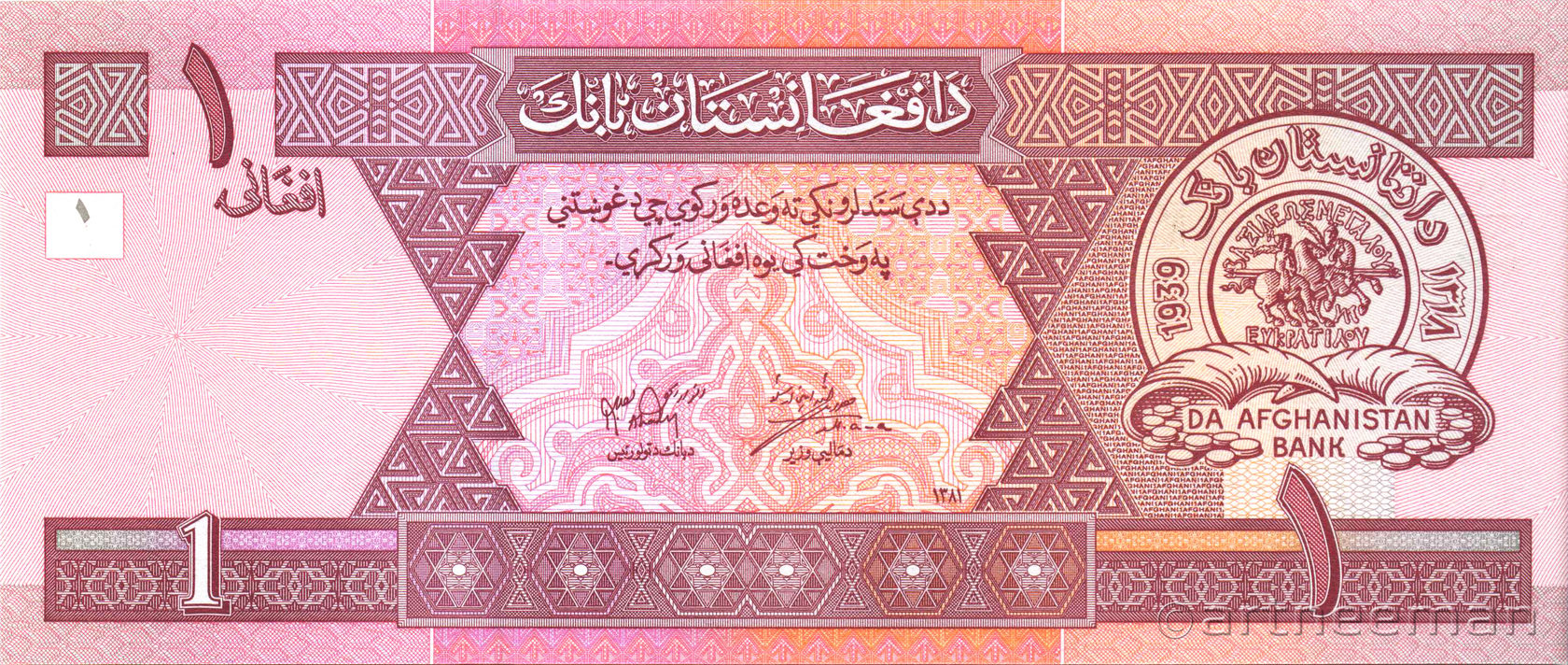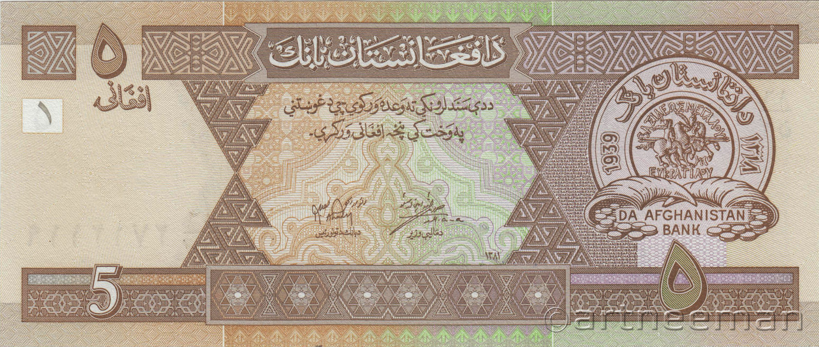 Лицевая сторона: Эмблема Центрального банка Афганистана. Печать Банка Da Afghanistan имеет название банка на языке пушту в верхней и латинскими буквами в нижней части, год основания баанка 1939, внутри монета эпохи Евкратида I, имеющая греческий текст "ΒΑΣΙΛΕΩΣ ΜΕΓΑΛΟΥ ΕΥΚΡΑΤΙΔΟΥ" который значает «Великий царь Евкратид».