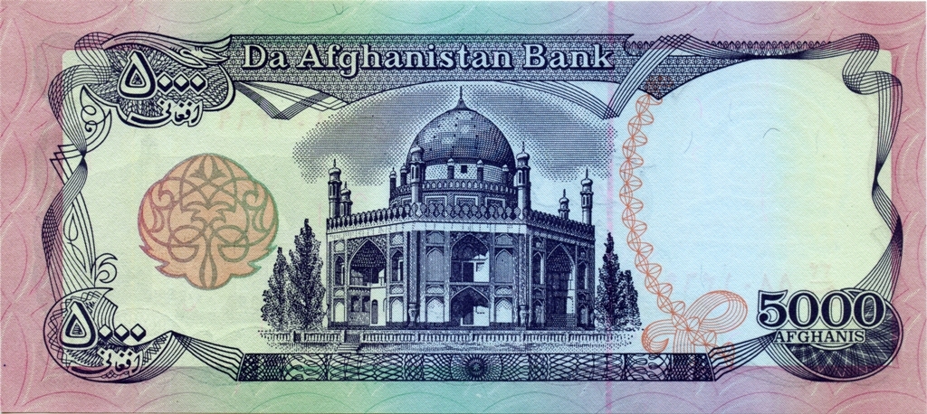 Оборотная сторона: Мавзолей Ахмад-шаха Дуррани (также известен как Ахмад-шах Абдали — основатель Дурранийской империи, которая является началом современного Афганистана) в Кандагаре.