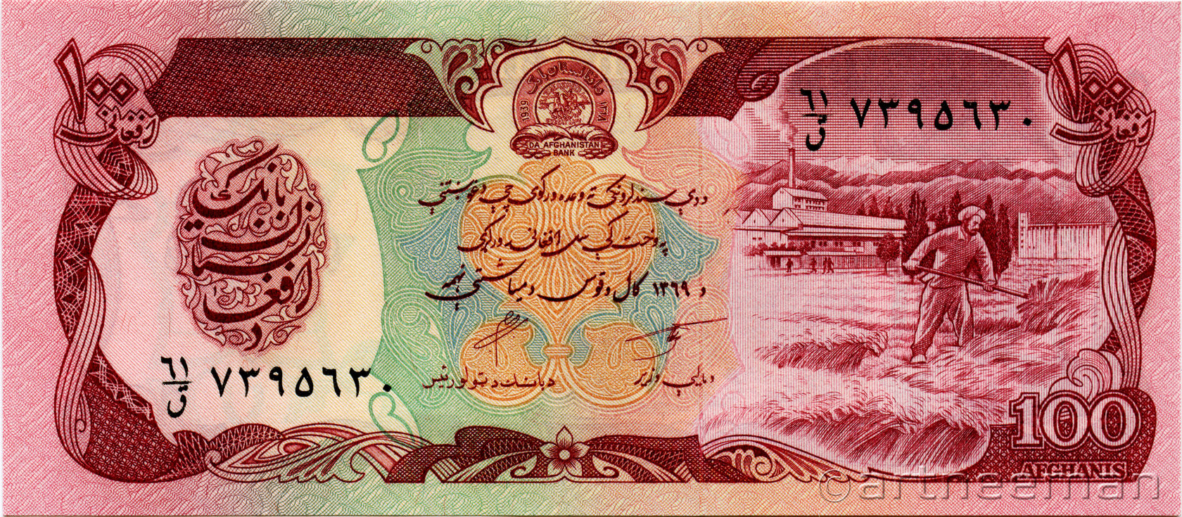 Лицевая сторона: Эмблема Центрального банка Афганистана; Фермер в пшеничном поле.