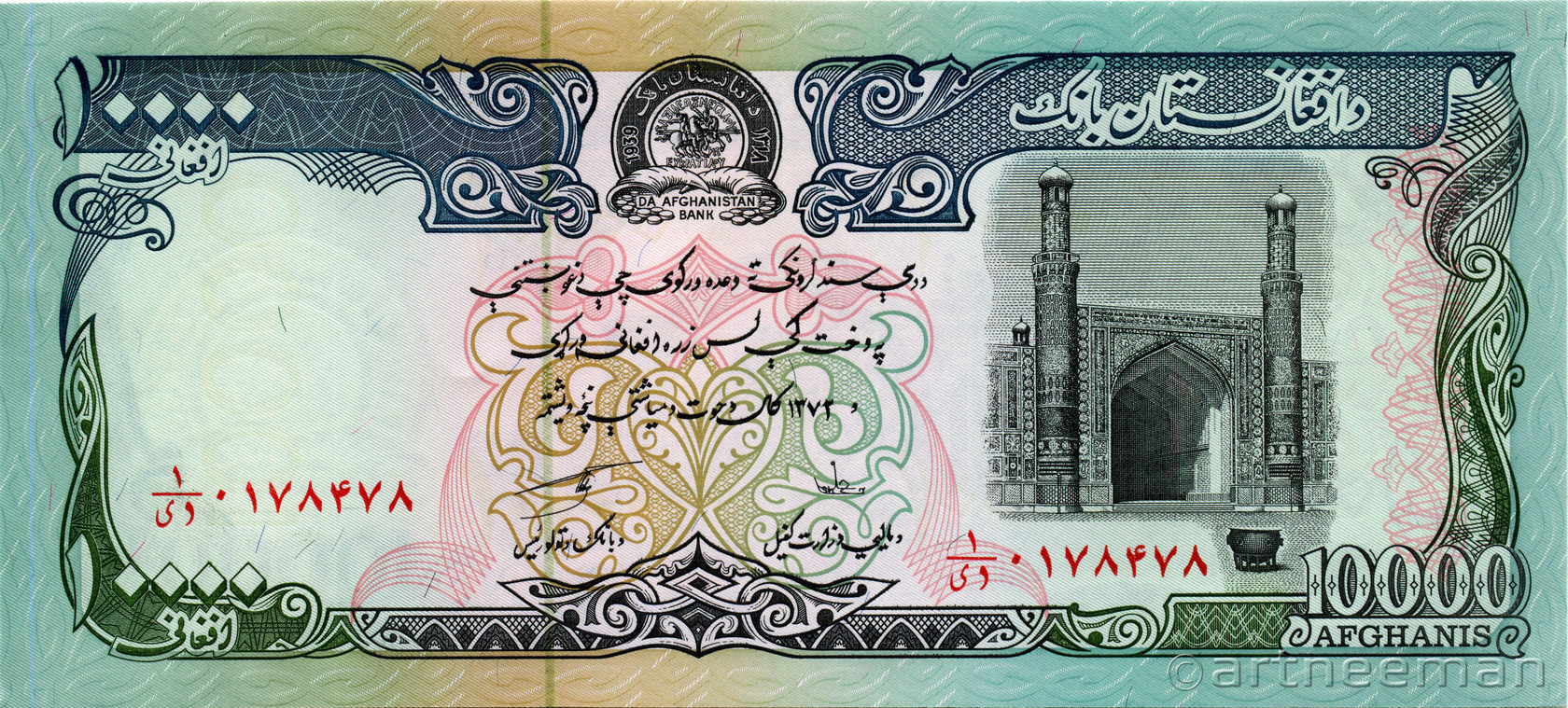Лицевая сторона: Эмблема Центрального банка Афганистана, Джума-мечеть - Больша́я собо́рная мече́ть в Герате — пятничная мечеть 1200 года постройки, отличается грандиозными размерами: 96×75 метров.