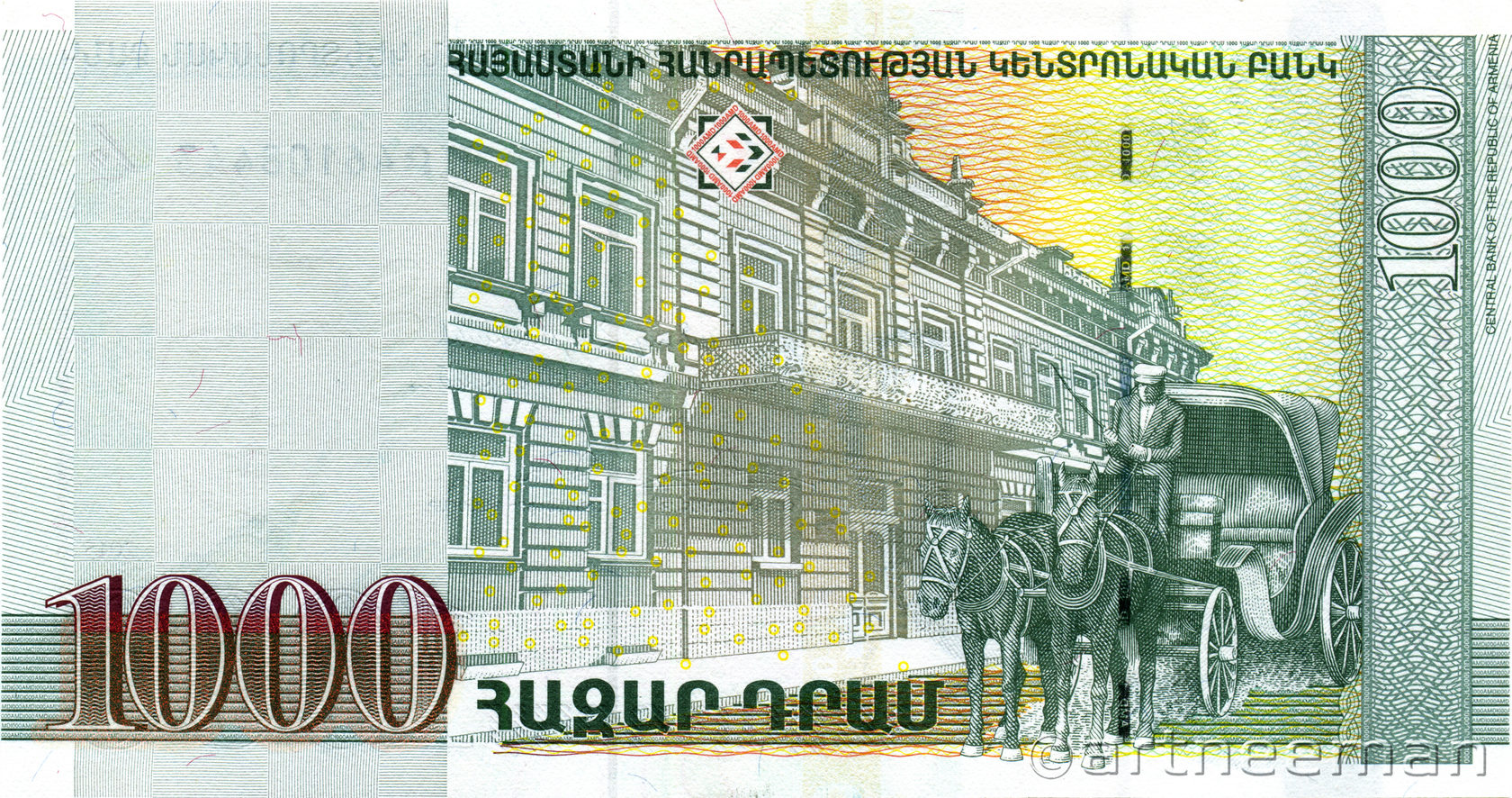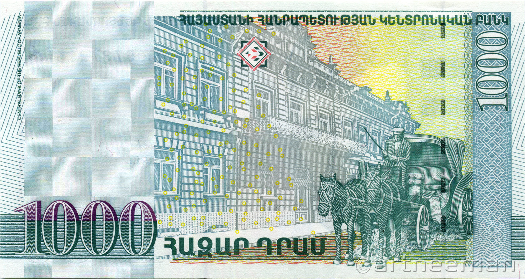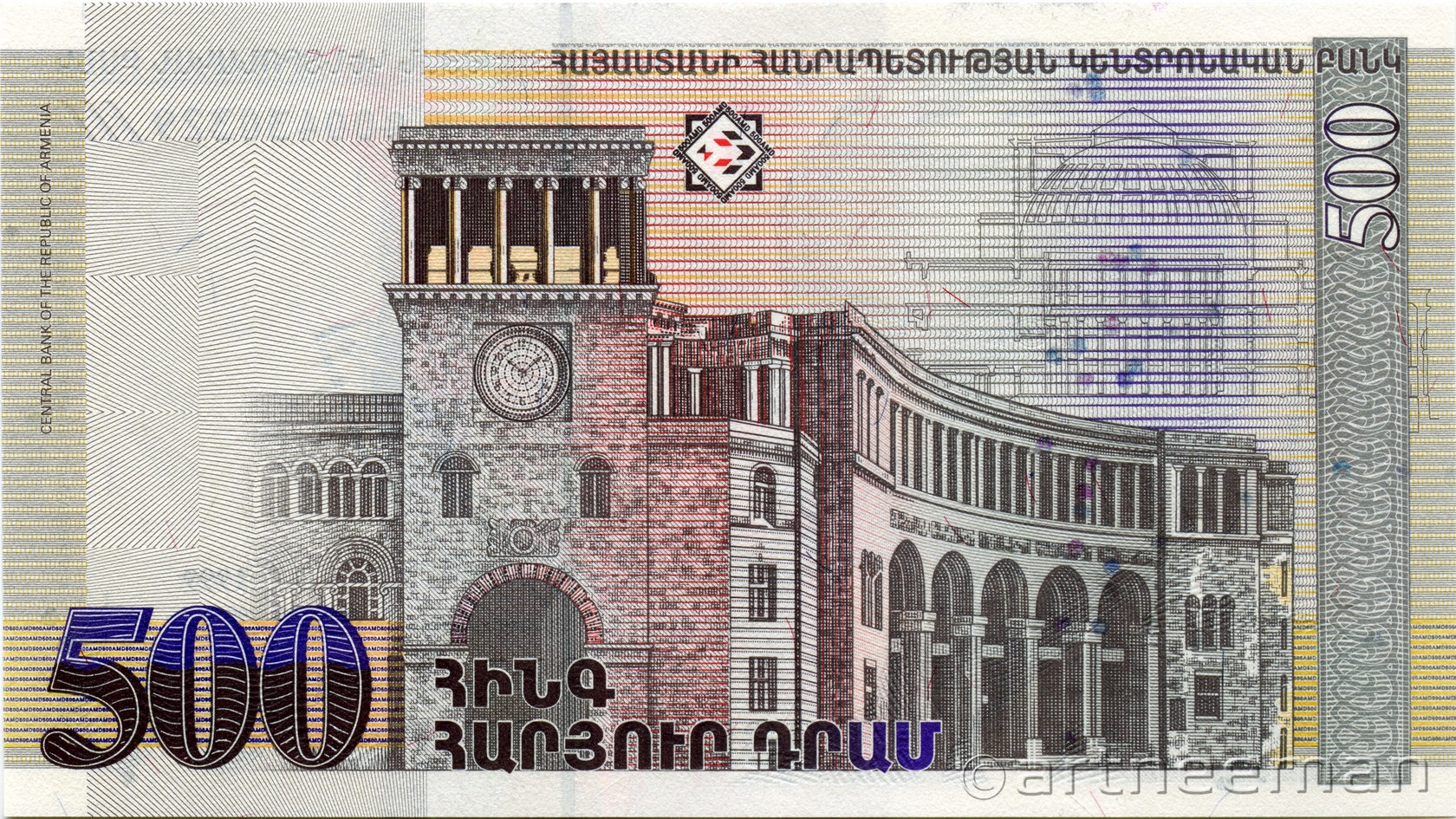 Оборотная сторона: Здание Правительства Республики Армения. Дом правительства является первым зданием, построенным на центральной овальной площади, предусмотренной генеральным планом Александра Таманяна в 1924 году, тем самым став ориентиром, определившим собой высоту, горизонтальные ответвления, масштаб, ритм и стилистические особенности зданий, построенных здесь в дальнейшем.
