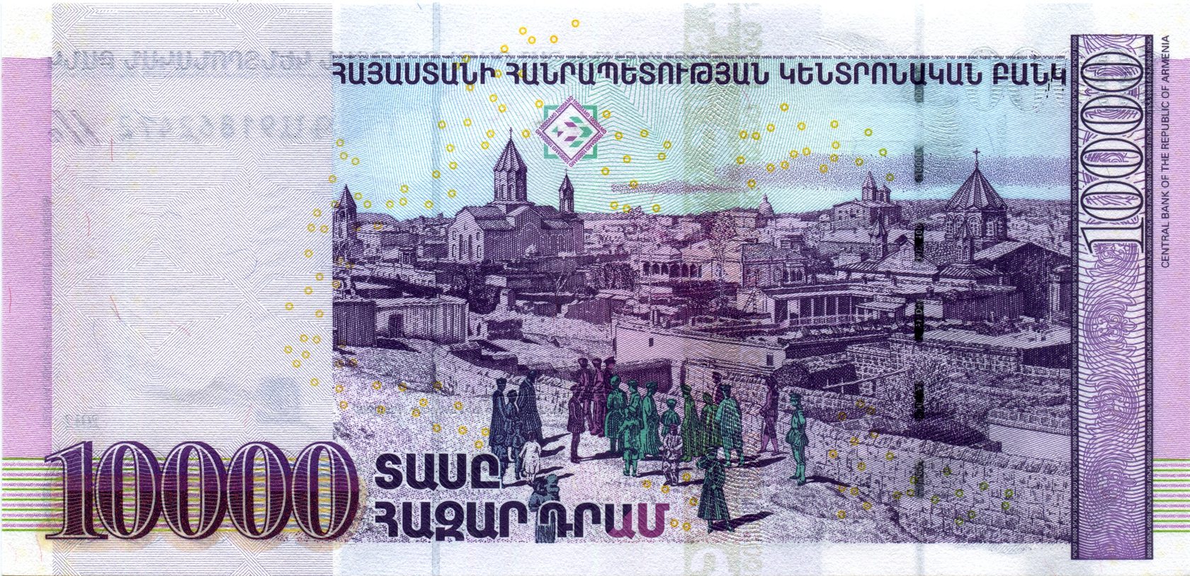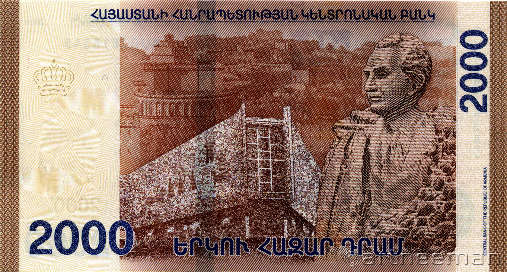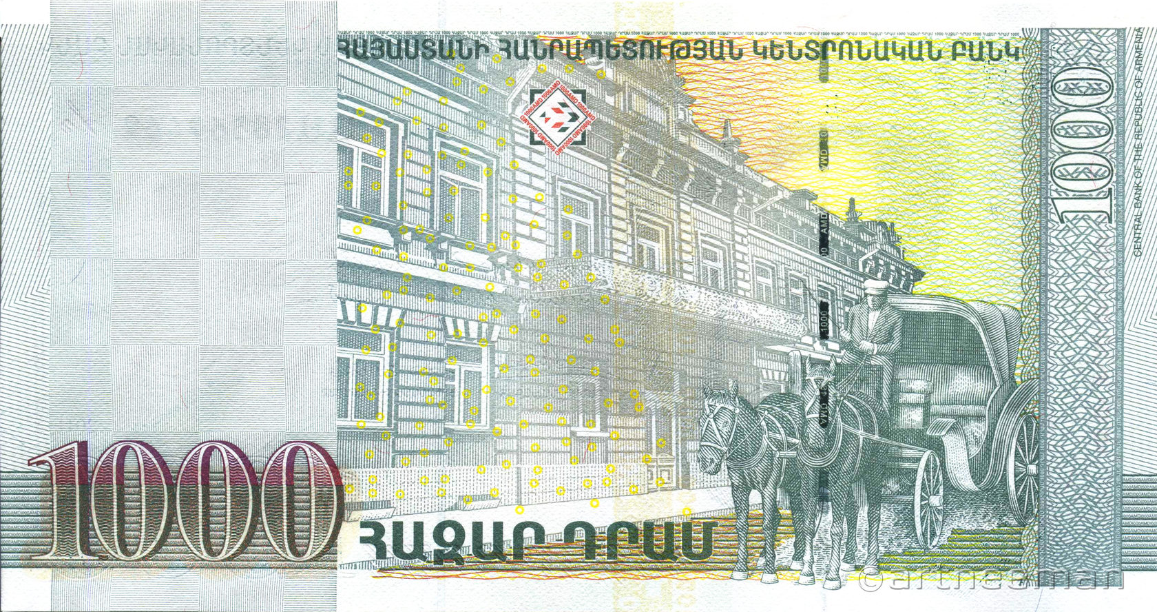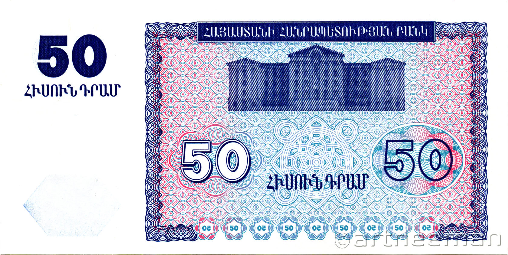 Оборотная сторона: Здание Правительства Республики Армения. Дом правительства является первым зданием, построенным на центральной овальной площади, предусмотренной генеральным планом Александра Таманяна в 1924 году, тем самым став ориентиром, определившим собой высоту, горизонтальные ответвления, масштаб, ритм и стилистические особенности зданий, построенных здесь в дальнейшем.