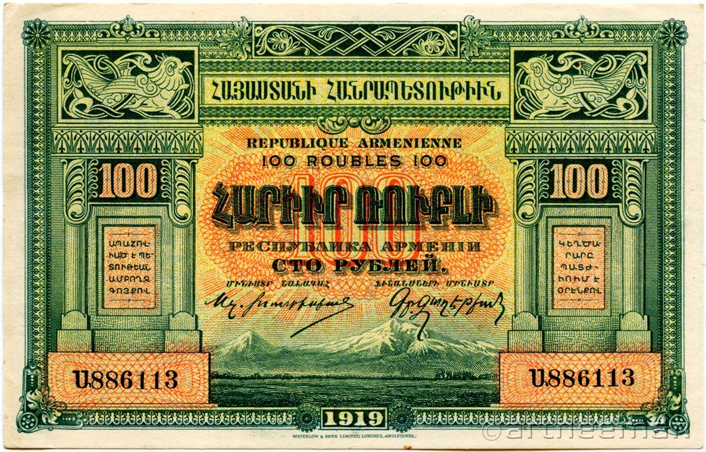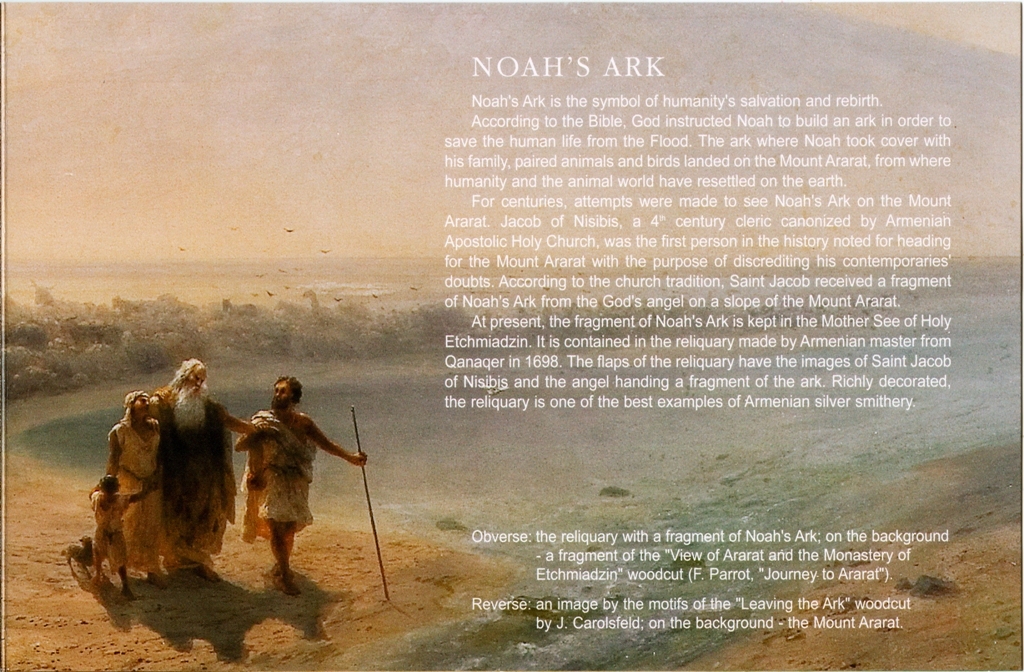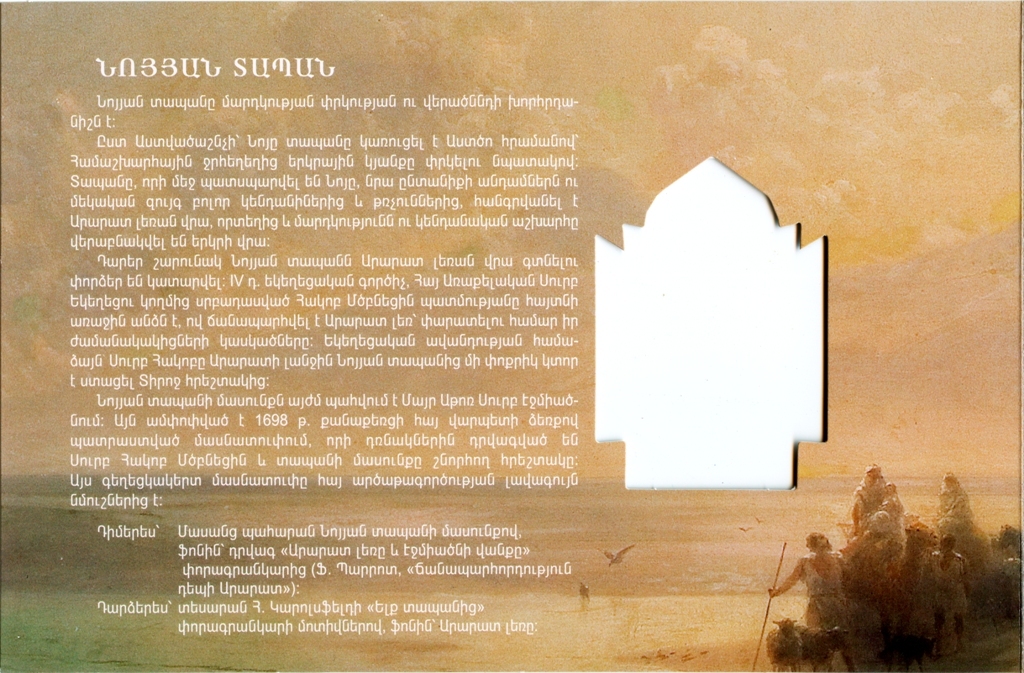 Лицевая сторона: Понорама горы Арарат, стилизованные птицы по краям поля.
