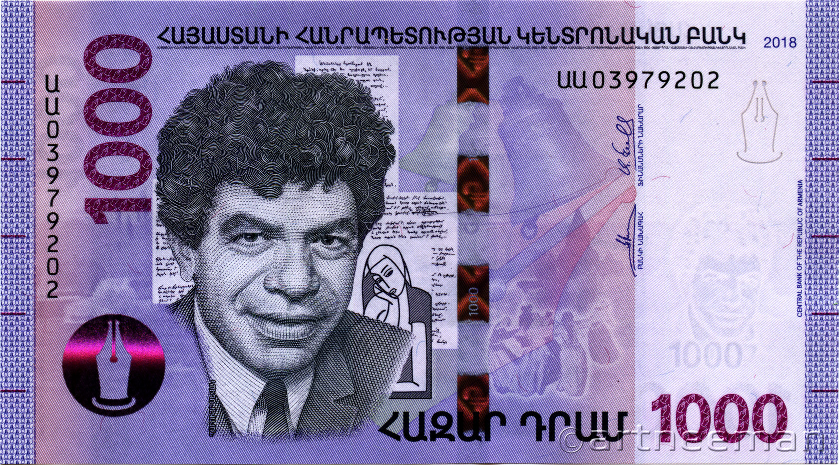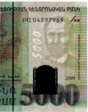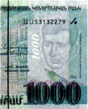 Водяной знак: Многотоновый водяной знак в виде Портрета Паруйра Севака и двутоновый водяной знак в виде номинала банкноты.