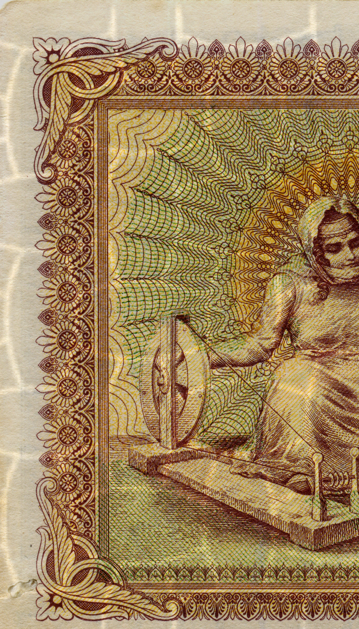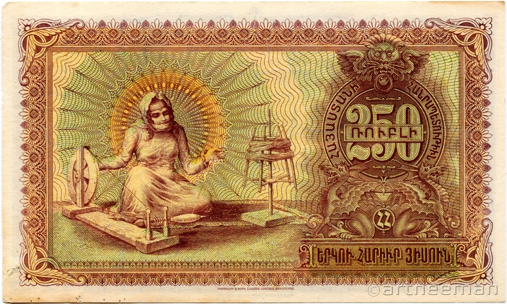Оборотная сторона: Изображение женщины в национальном костюме за прялкой — характерная черта армянского быта.