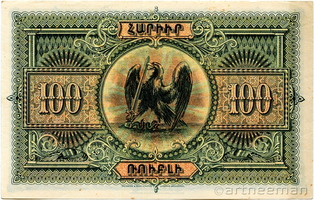 Оборотная сторона: Рисунок орла, разрубающего мечом змею (старинный герб Армении, принятый еще в начале нашей эры).