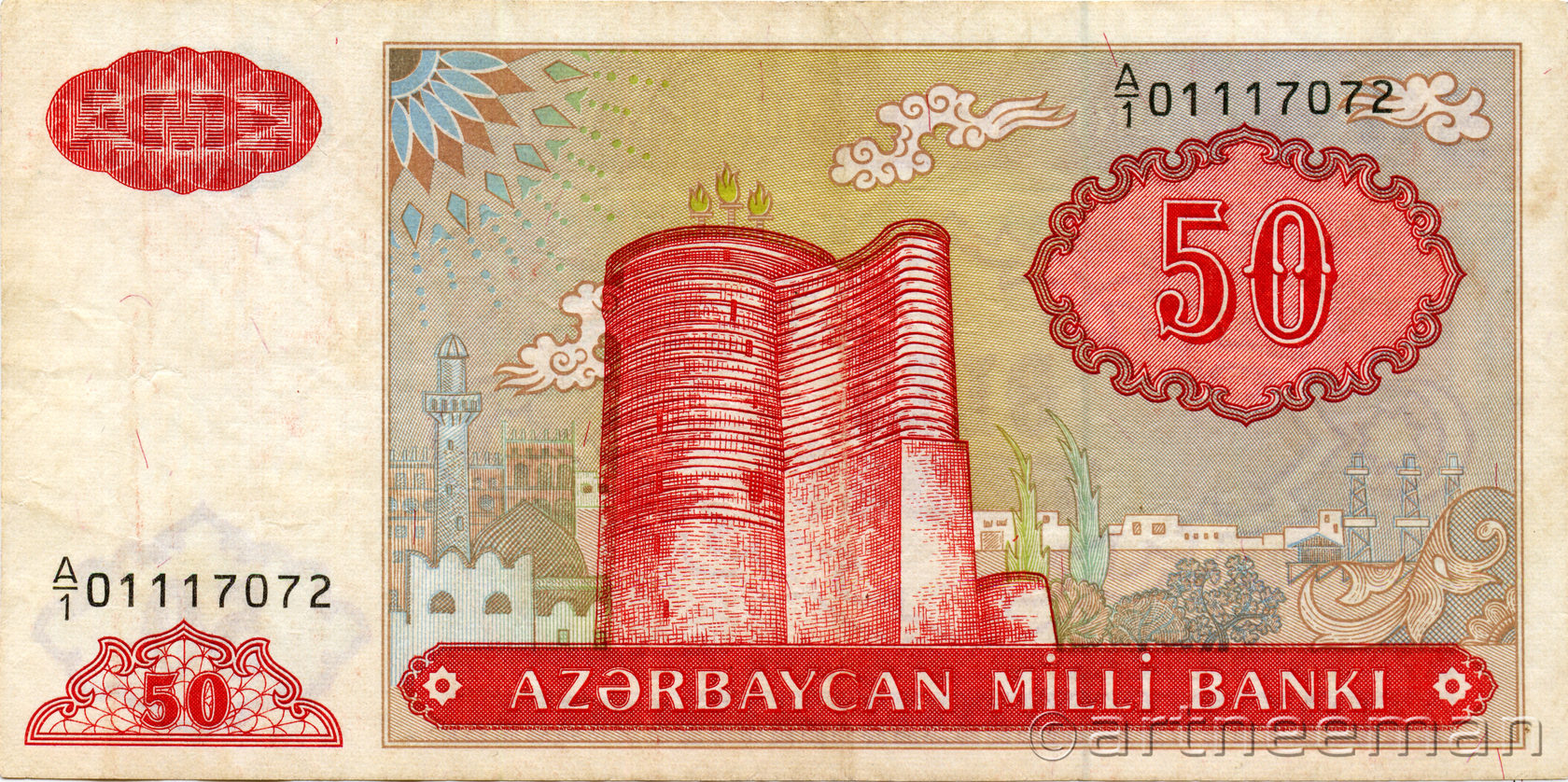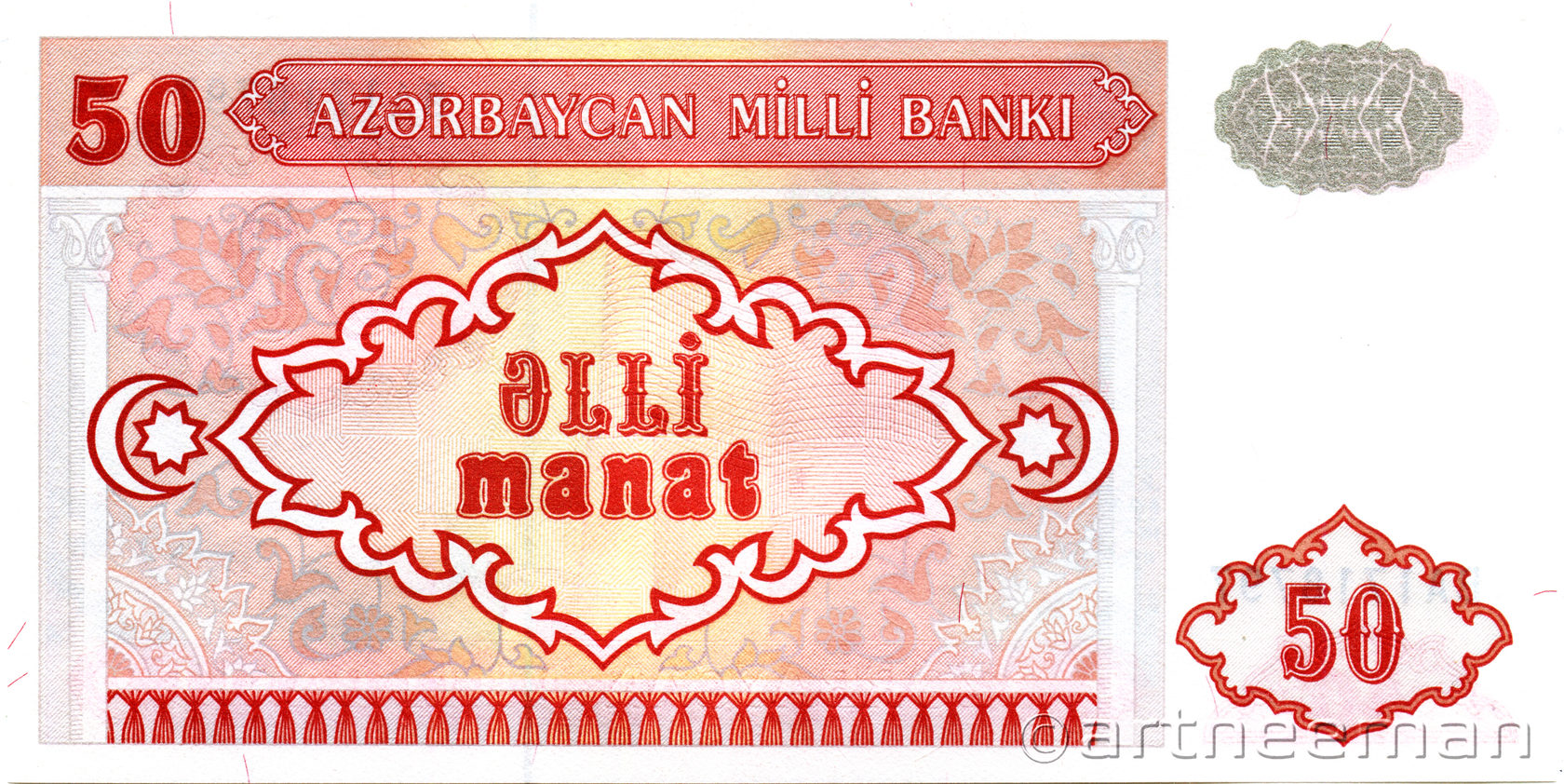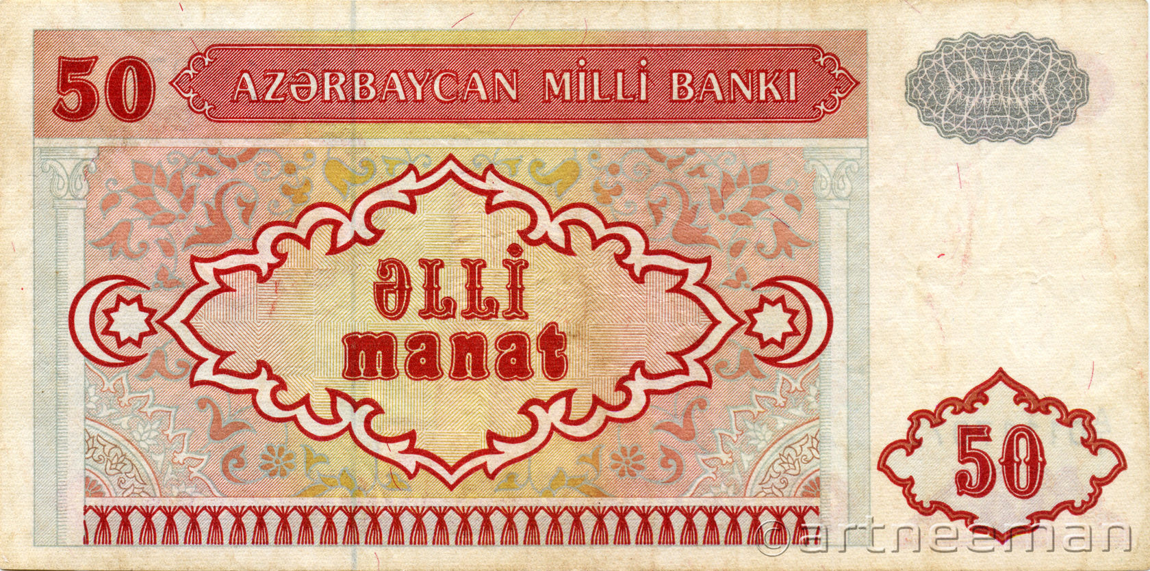 Оборотная сторона: Надпись «AZƏRBAYCAN MİLLİ BANKI» и обозначение номинала «ƏLLİ manat» на фоне национального орнамента.