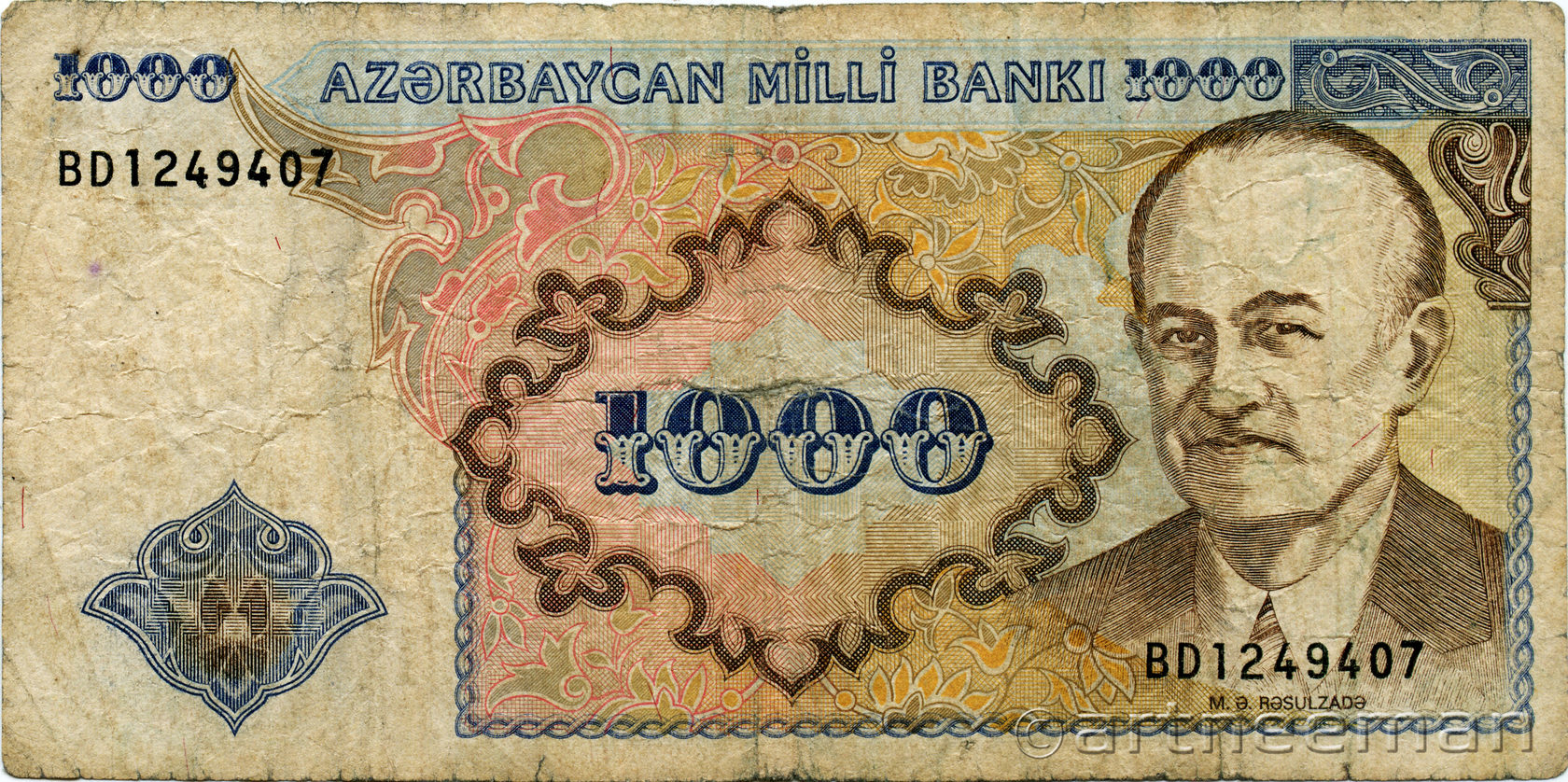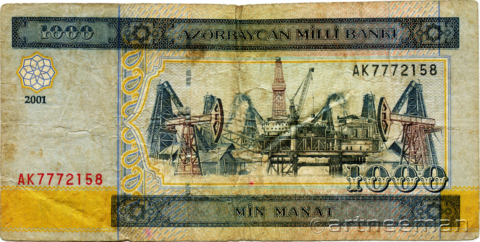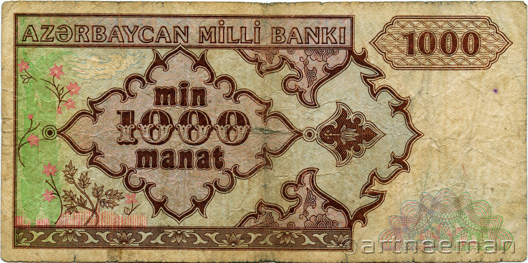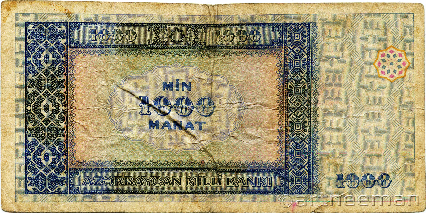 Оборотная сторона: Надпись «AZƏRBAYCAN MİLLİ BANKI» и обозначение номинала «MIN 1000 manat»