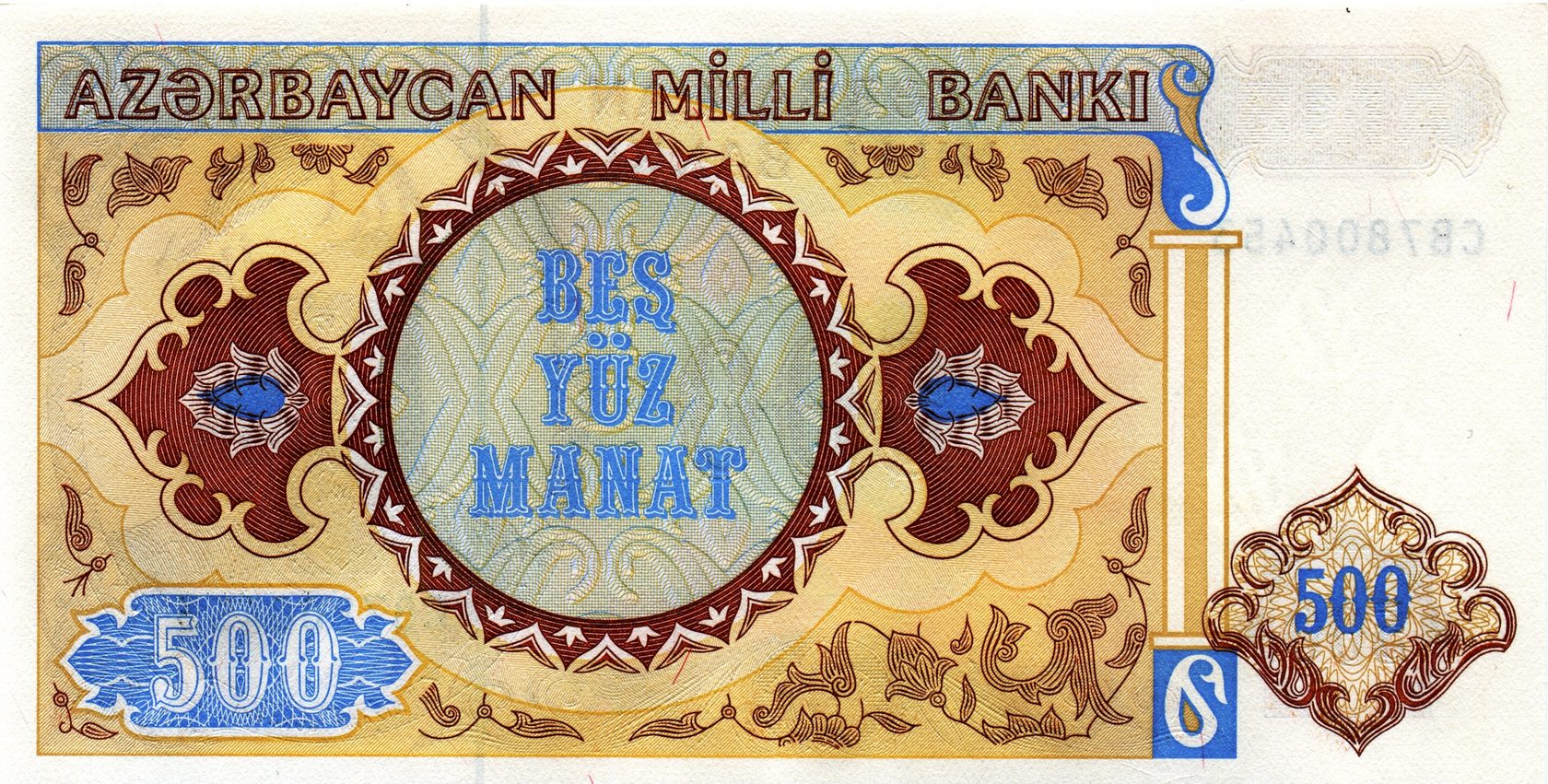 Оборотная сторона: Надпись «AZƏRBAYCAN MİLLİ BANKI» и обозначение номинала «BEŞ YÜZ manat»