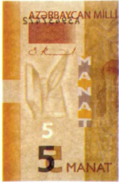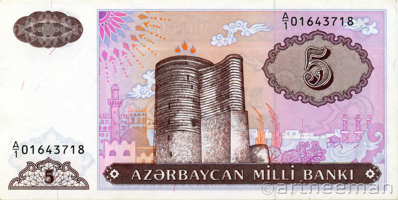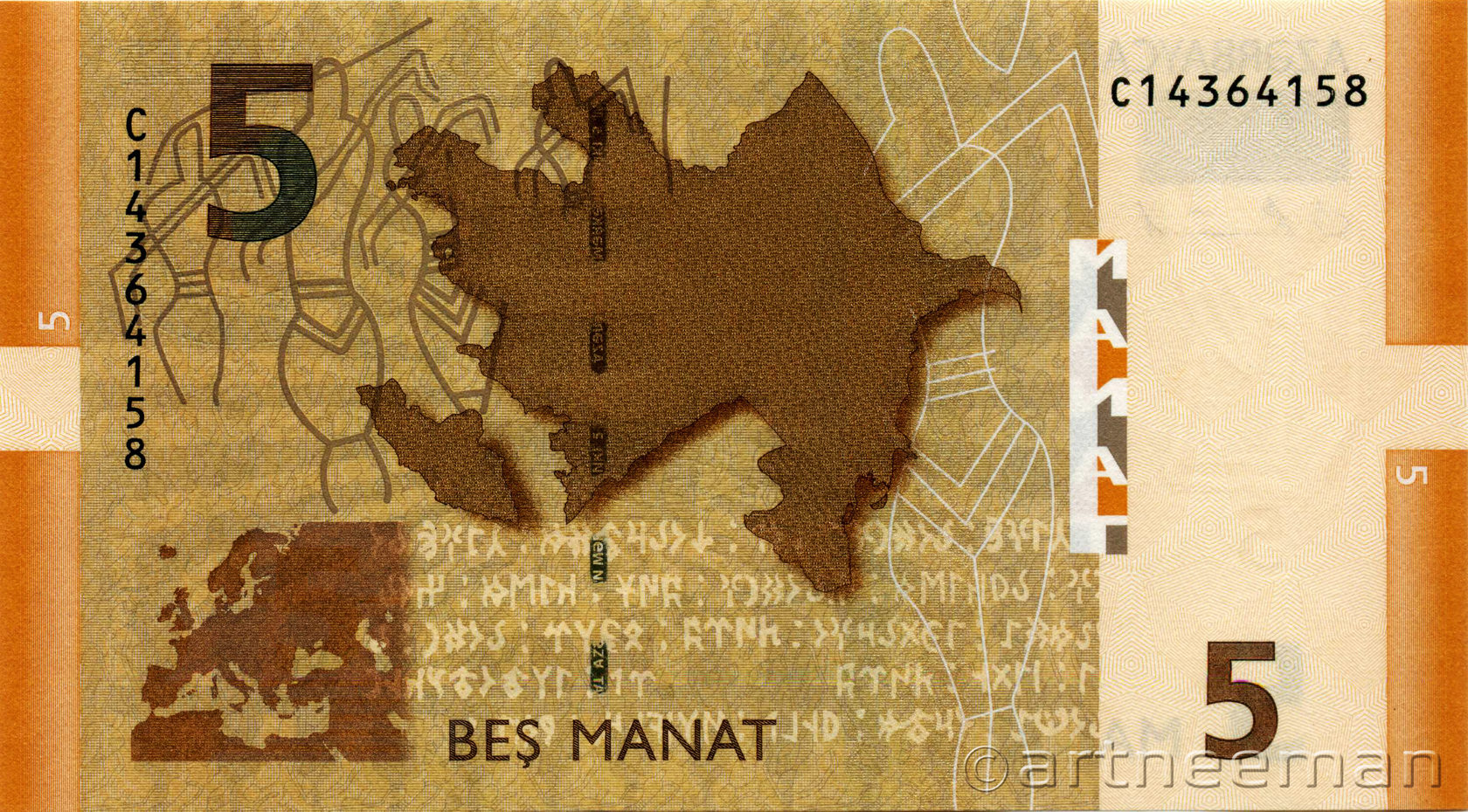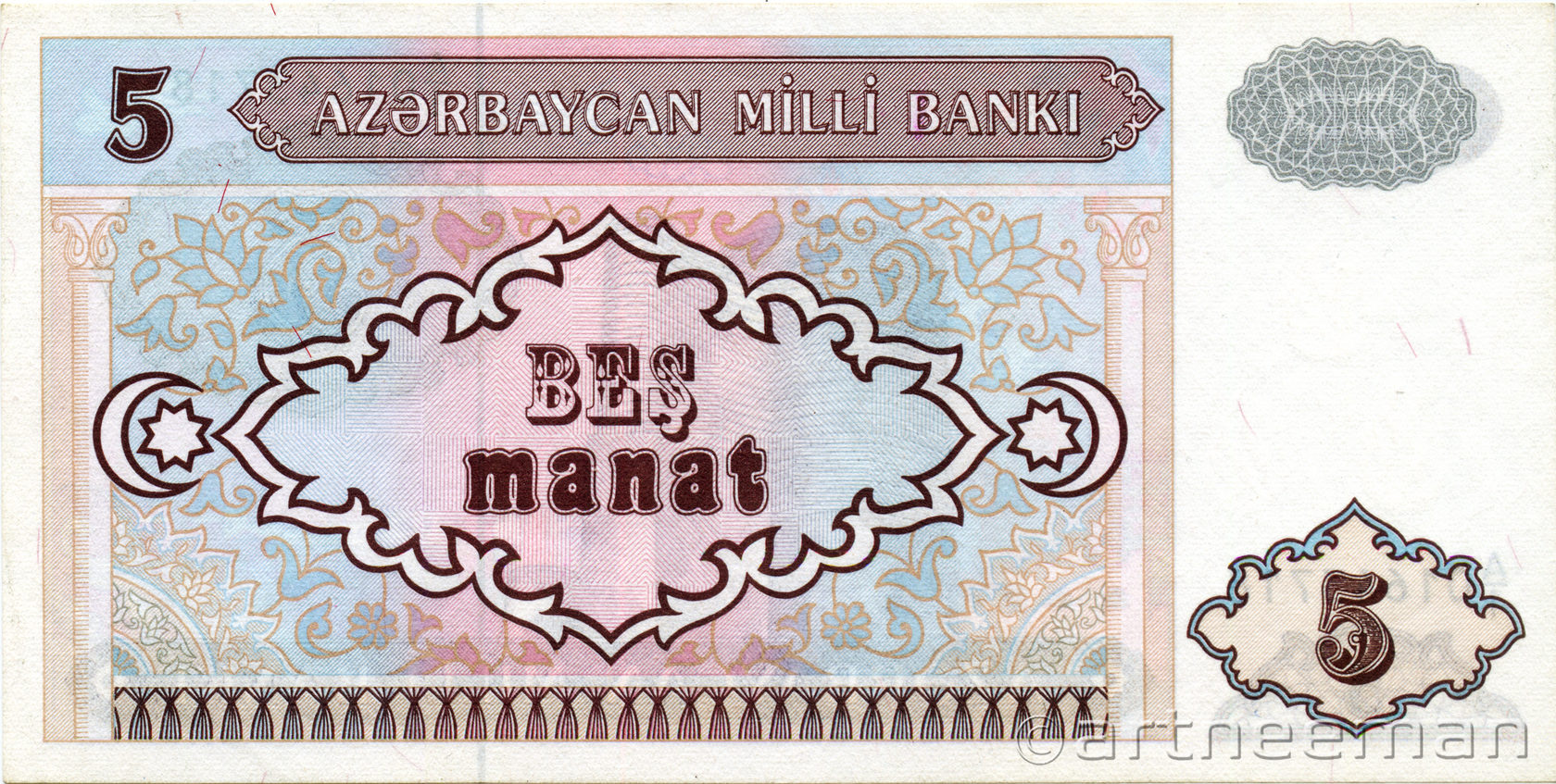Оборотная сторона: Надпись «AZƏRBAYCAN MİLLİ BANKI» и обозначение номинала «BEŞ manat» на фоне национального орнамента.