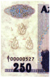 Оборотная сторона: Карта Азербайджана на фоне наскальных рисунков в Гобустане, а также текст на древнетюрксом алфавите