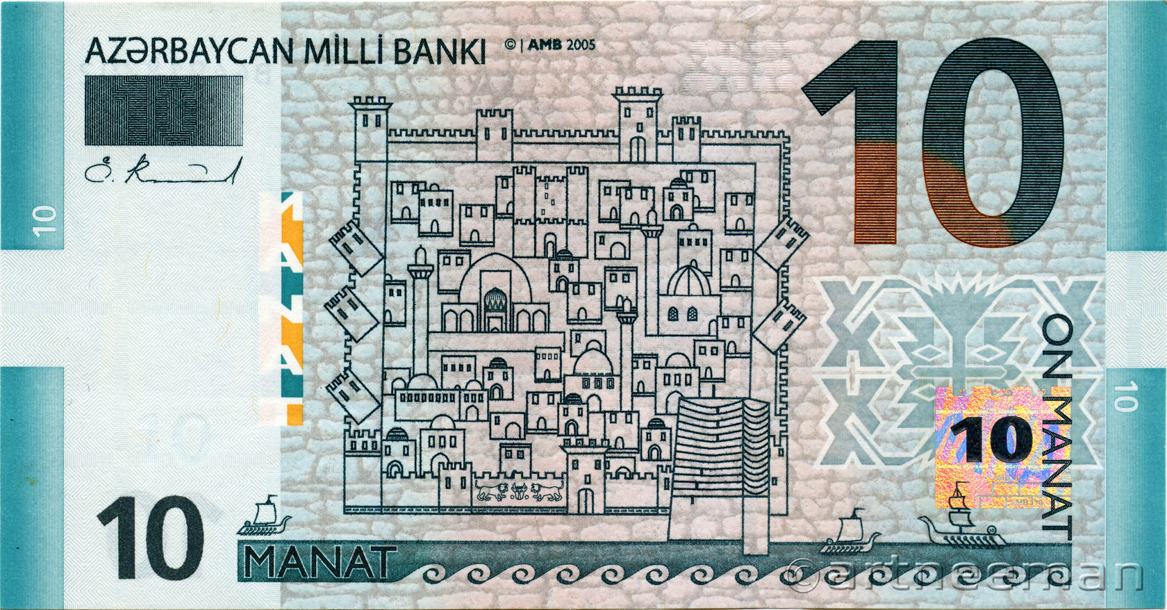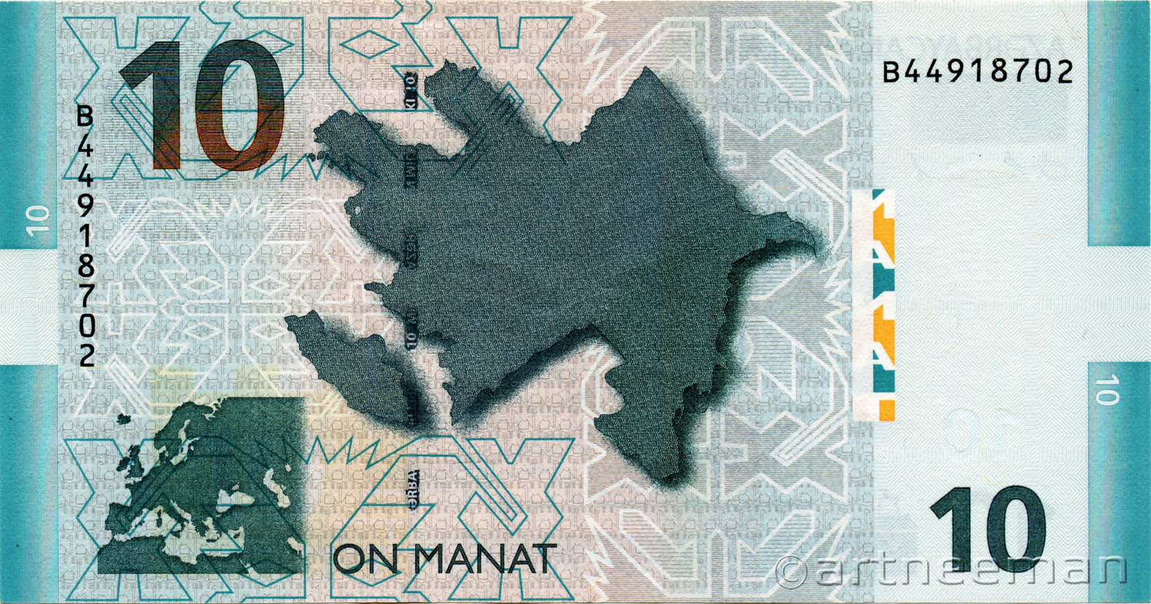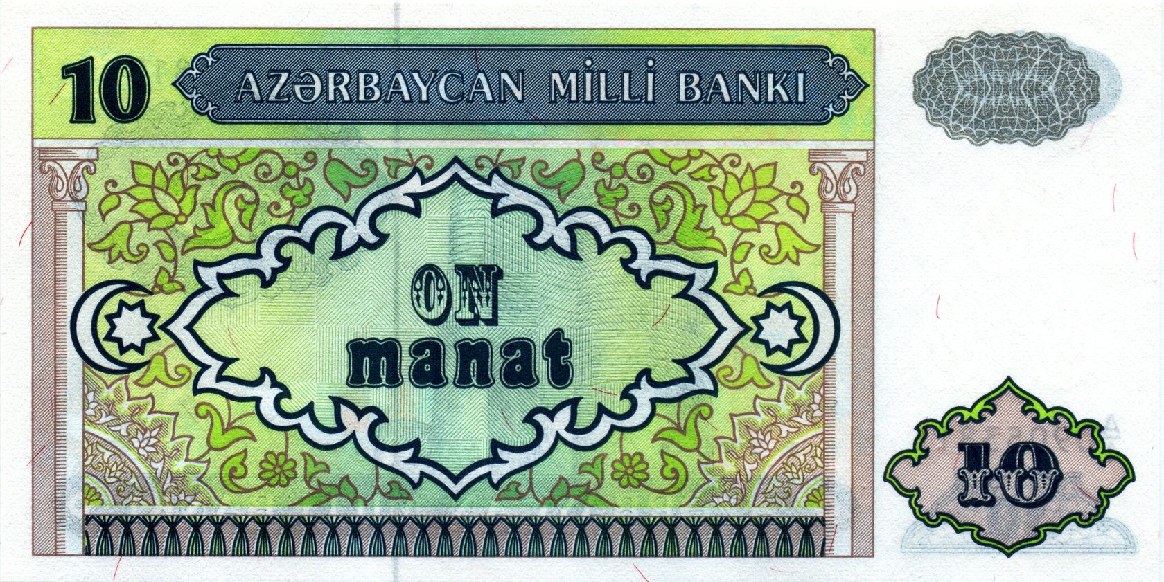 Оборотная сторона: Надпись «AZƏRBAYCAN MİLLİ BANKI» и обозначение номинала «ON manat» на фоне национального орнамента.