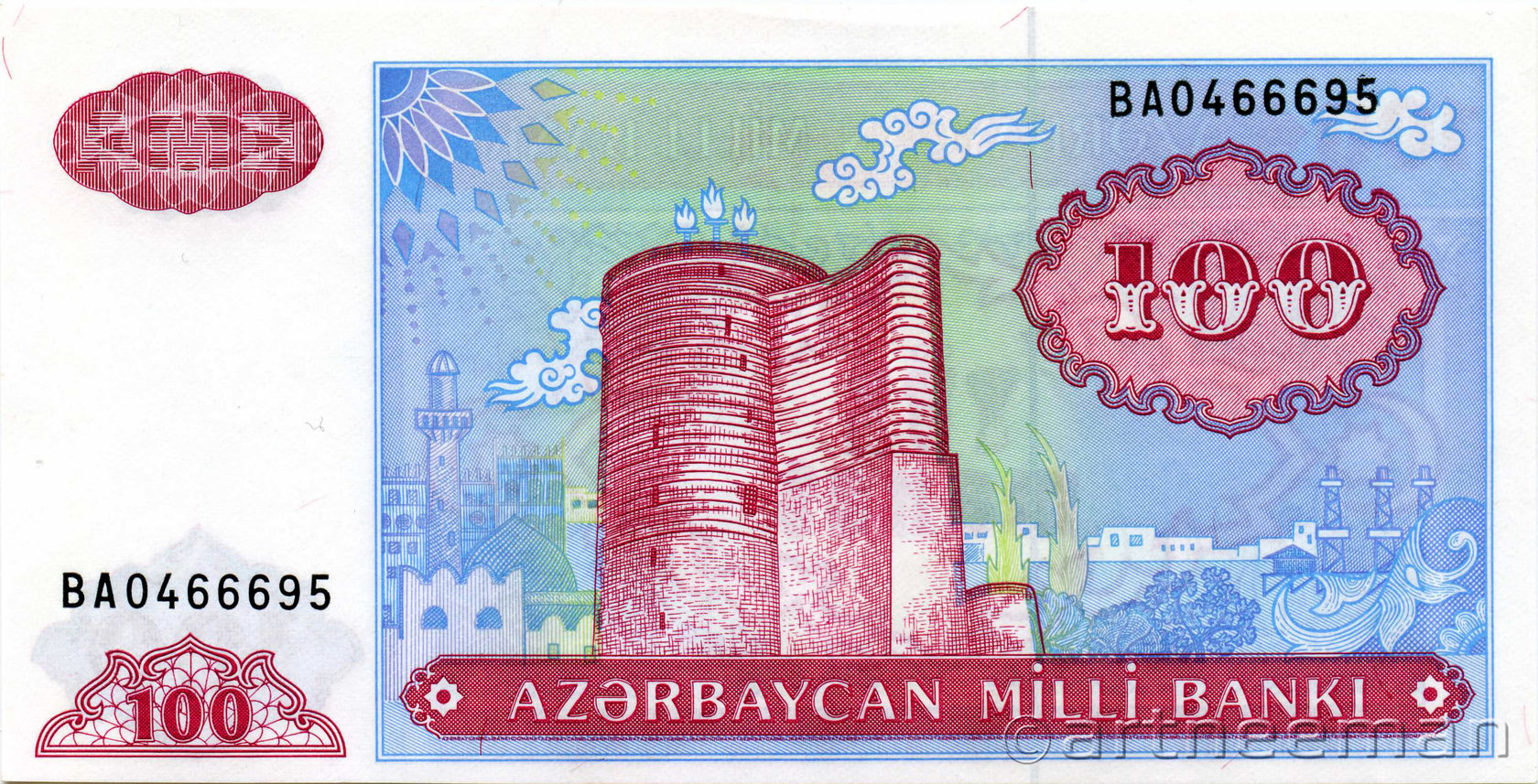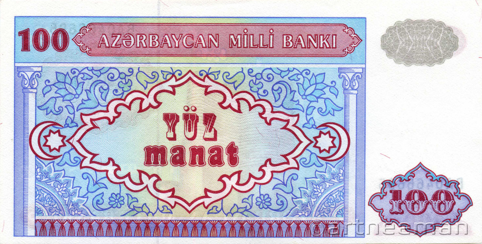 Оборотная сторона: Надпись «AZƏRBAYCAN MİLLİ BANKI» и обозначение номинала «YÜZ manat»