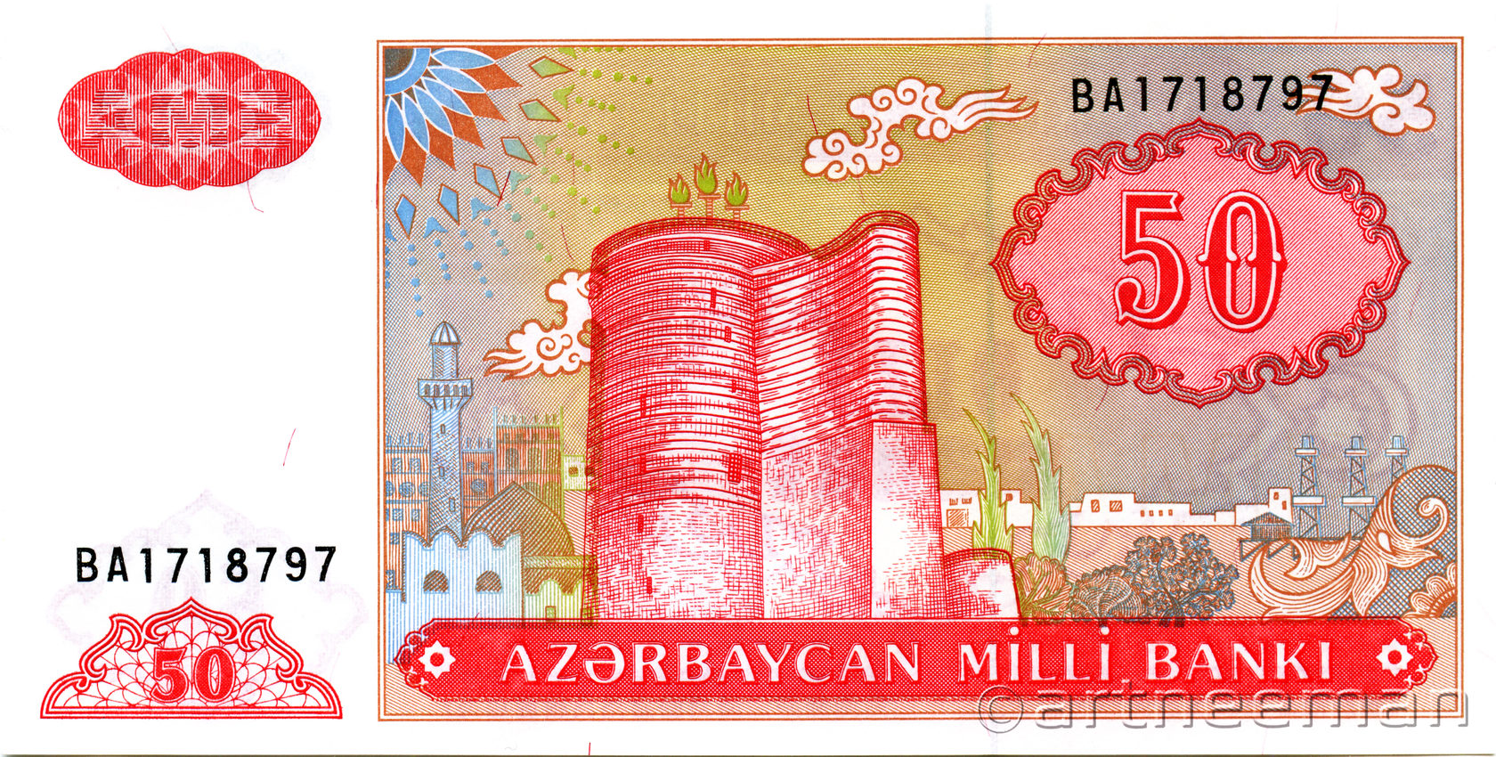 Лицевая сторона: Девичья башня — древняя крепостная постройка у прибрежной части «Старого города» Ичери-шехер в Баку. Номинал.