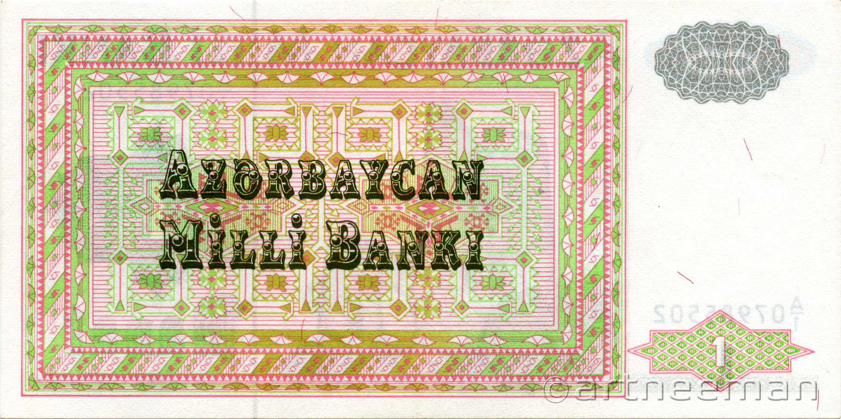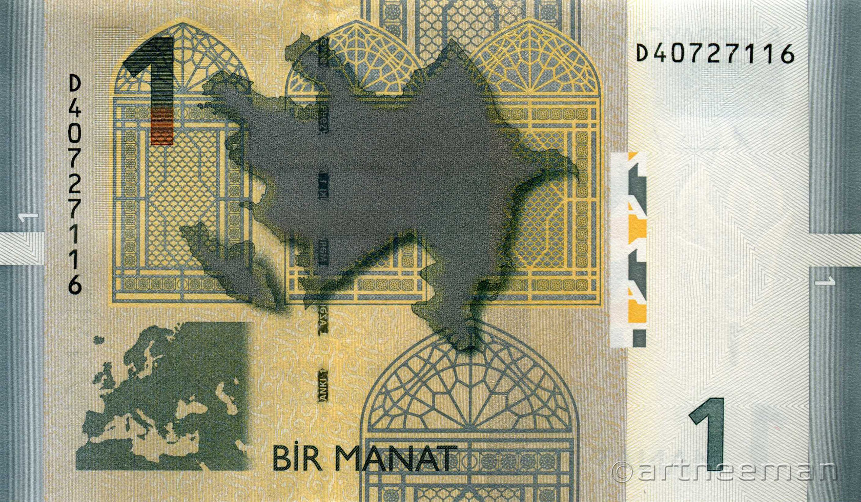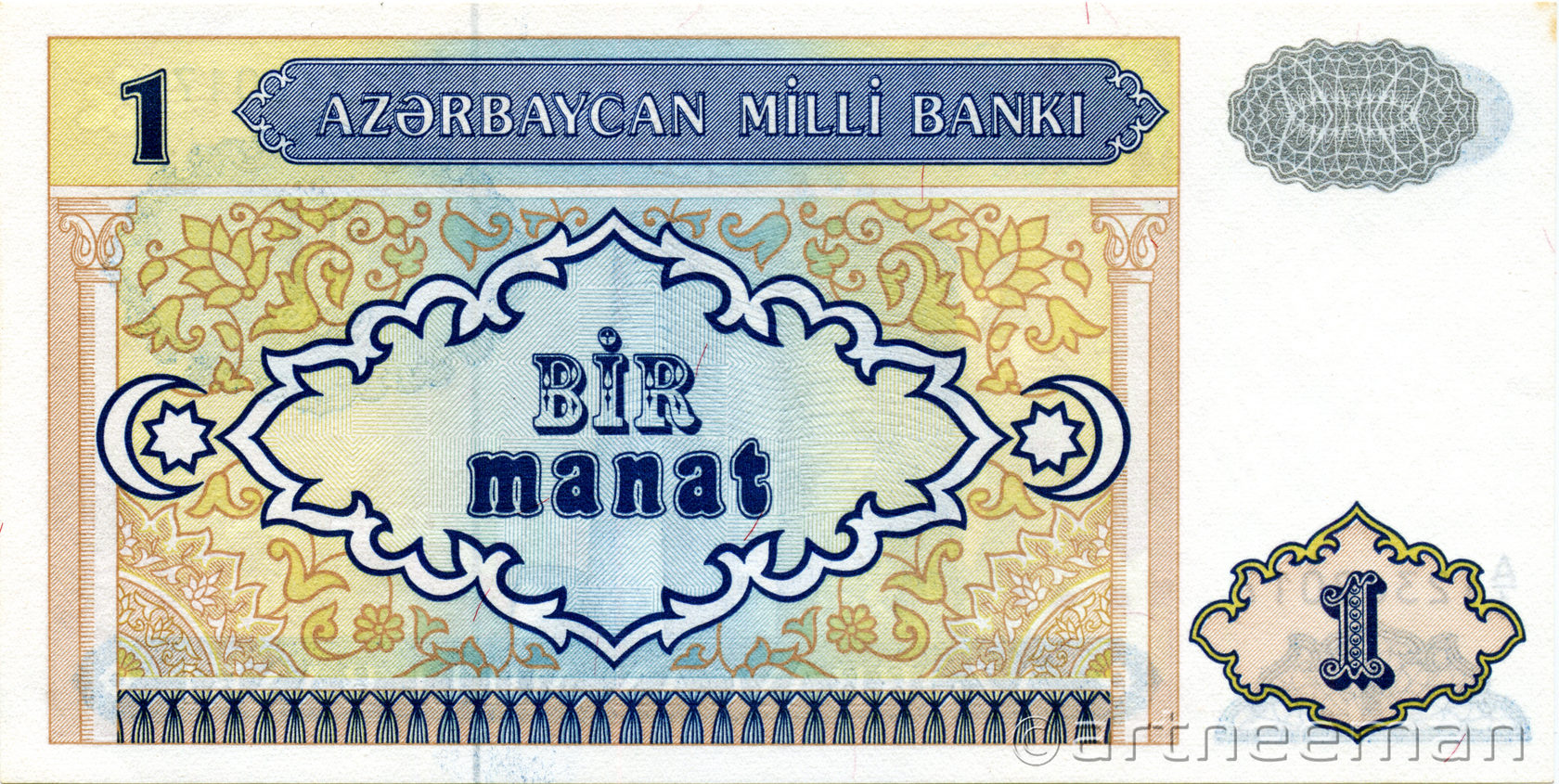 Оборотная сторона: Надпись «AZƏRBAYCAN MİLLİ BANKI» и обозначение номинала «BIR manat» на фоне национального орнамента.