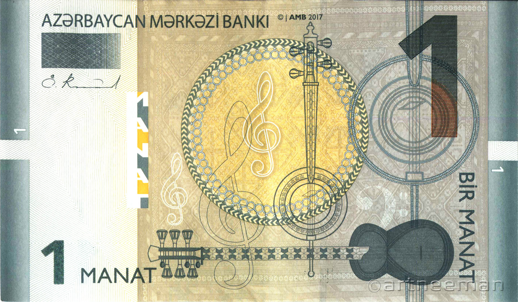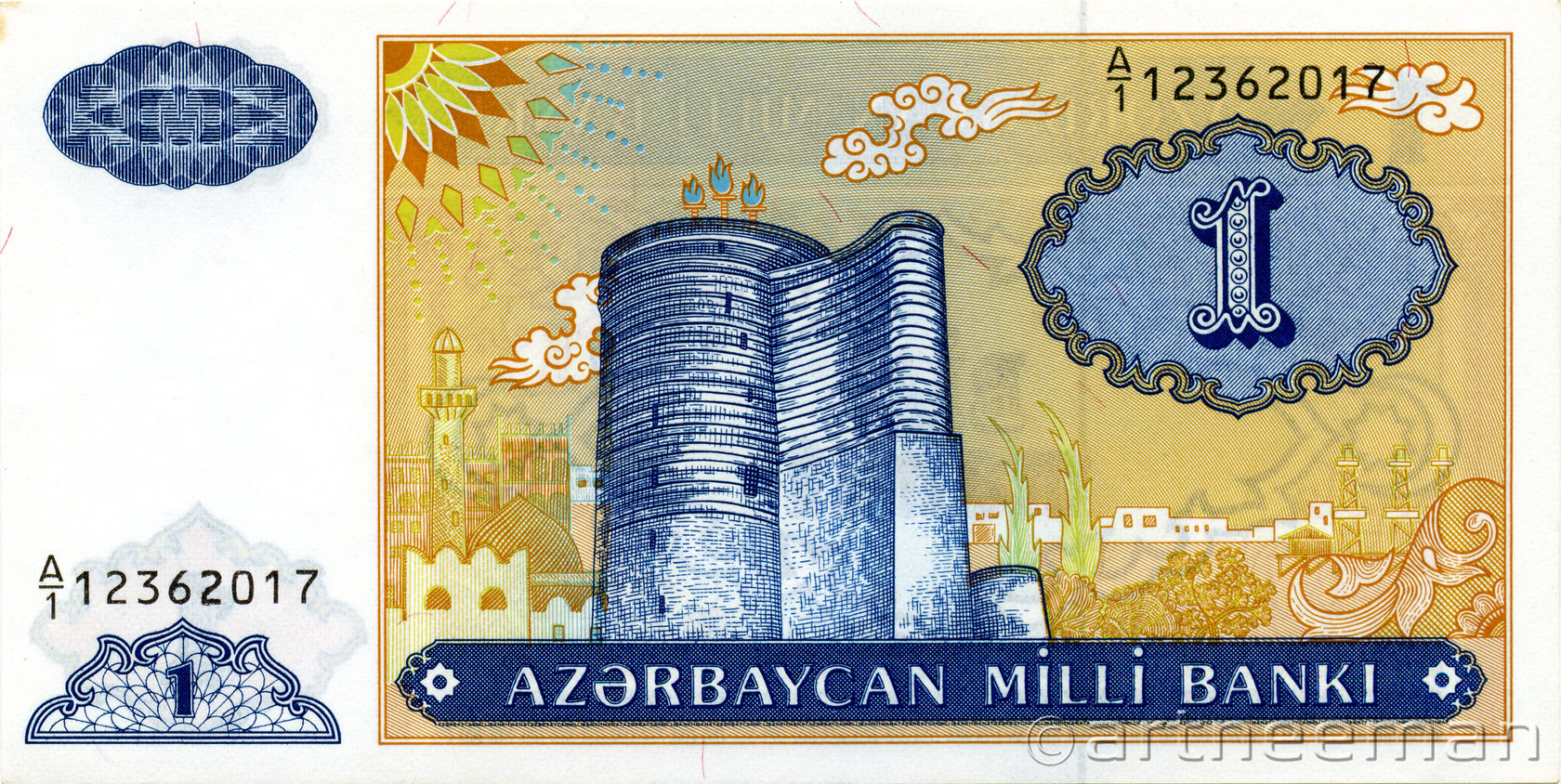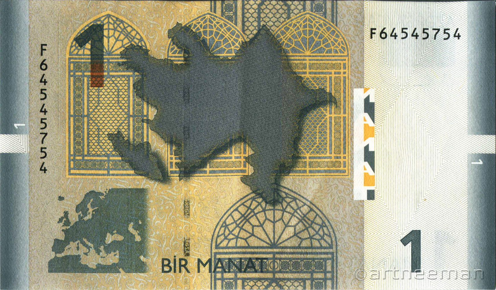 Оборотная сторона: Надпись «AZƏRBAYCAN MİLLİ BANKI» и обозначение номинала «BIR manat» на фоне национального орнамента.