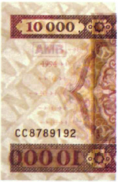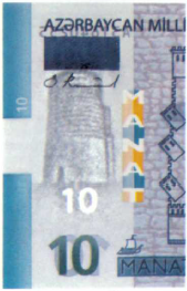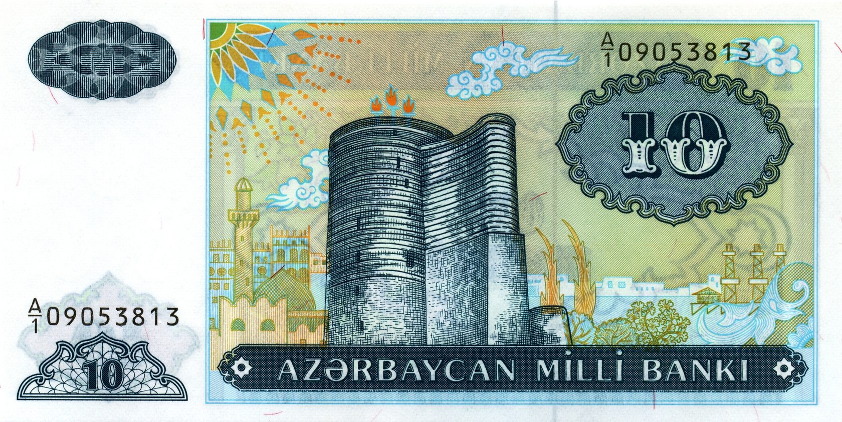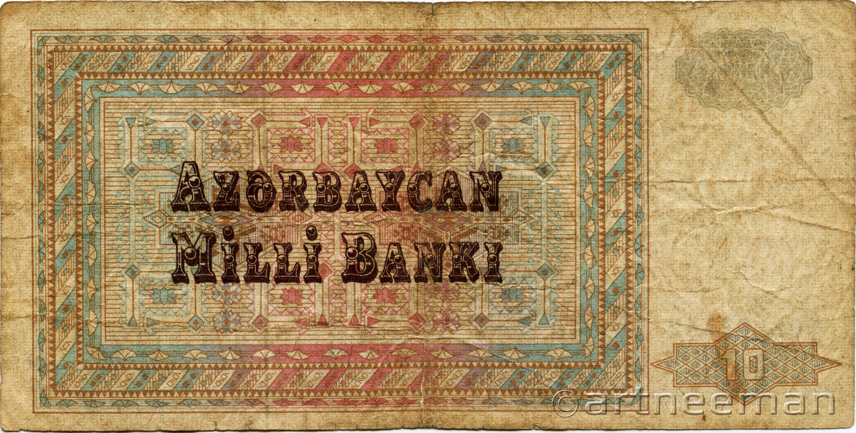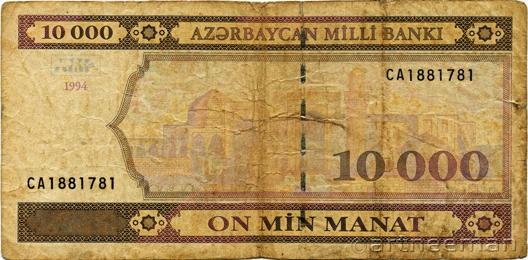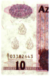 Оборотная сторона: Надпись «AZƏRBAYCAN MİLLİ BANKI» и обозначение номинала «ON MİN 10 000 manat»