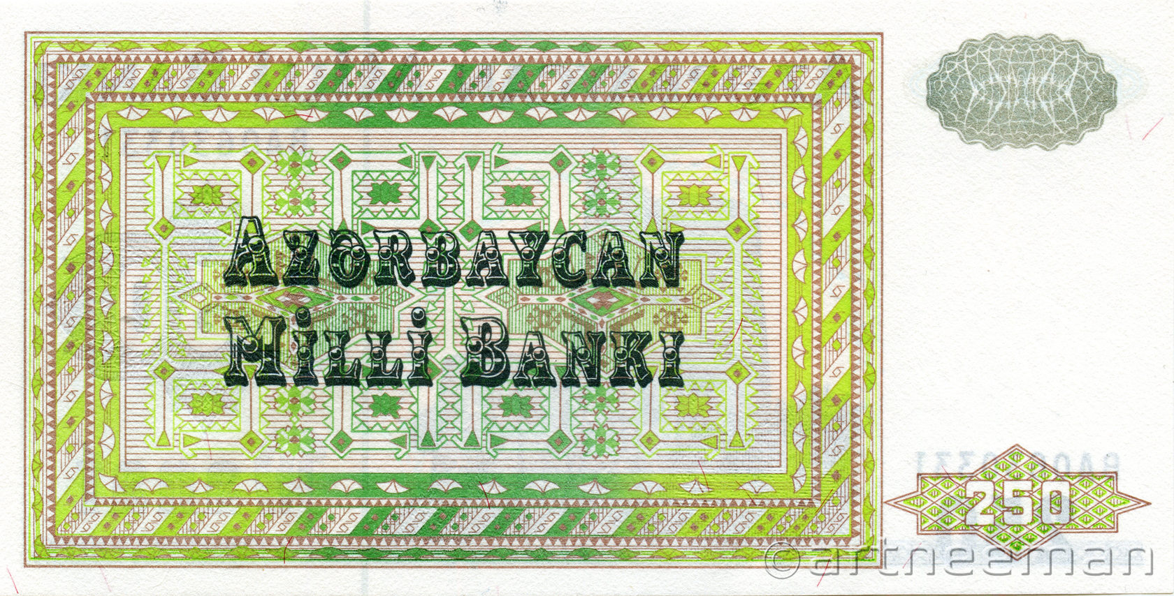 Оборотная сторона: Надпись «AZƏRBAYCAN MİLLİ BANKI» на фоне национального ковра.