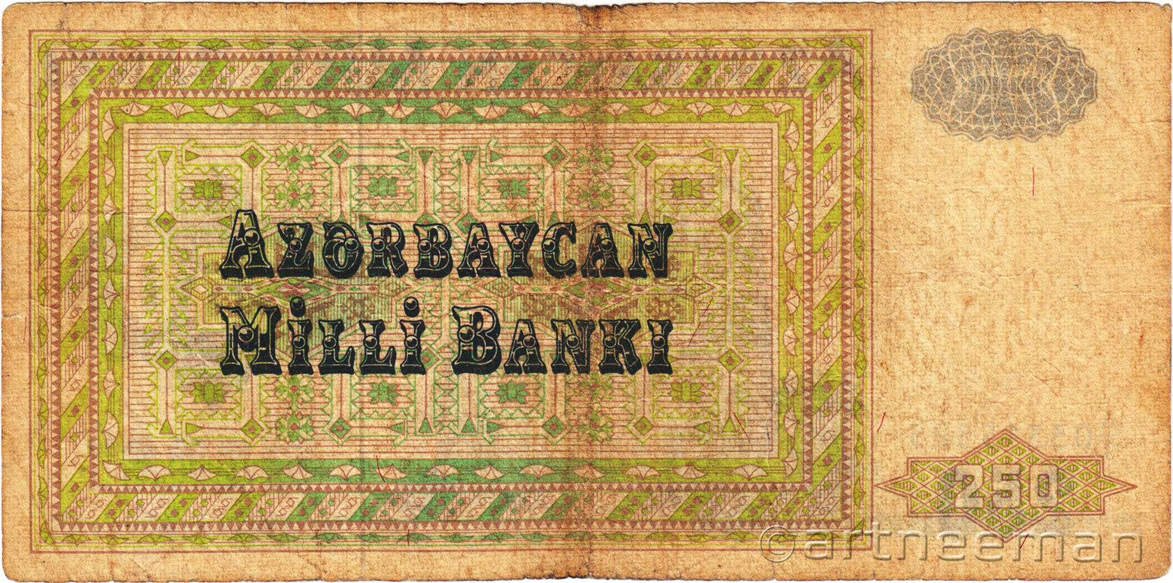 Лицевая сторона: Портрет Мамеда Эмина Расулзаде - Мамед Эмин Ахунд Гаджи Молла Алекпер оглы Расулзаде́ — азербайджанский государственный, политический и общественный деятель, журналист и драматург, председатель Национального Совета Азербайджана в 1918 году. Номинал.