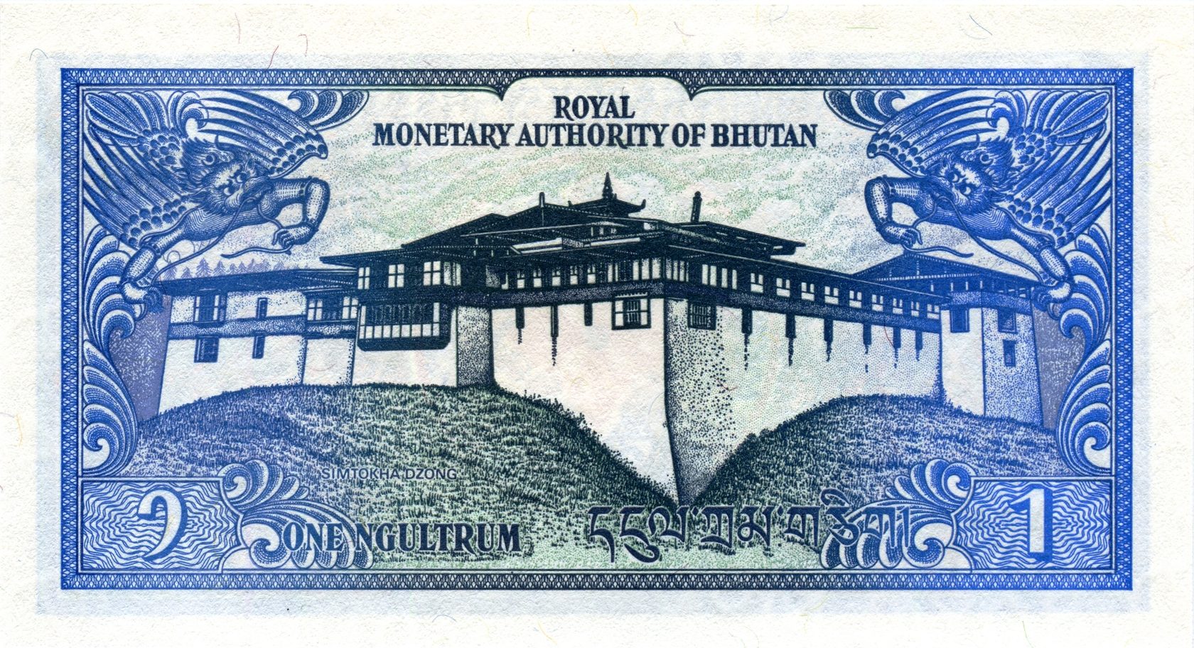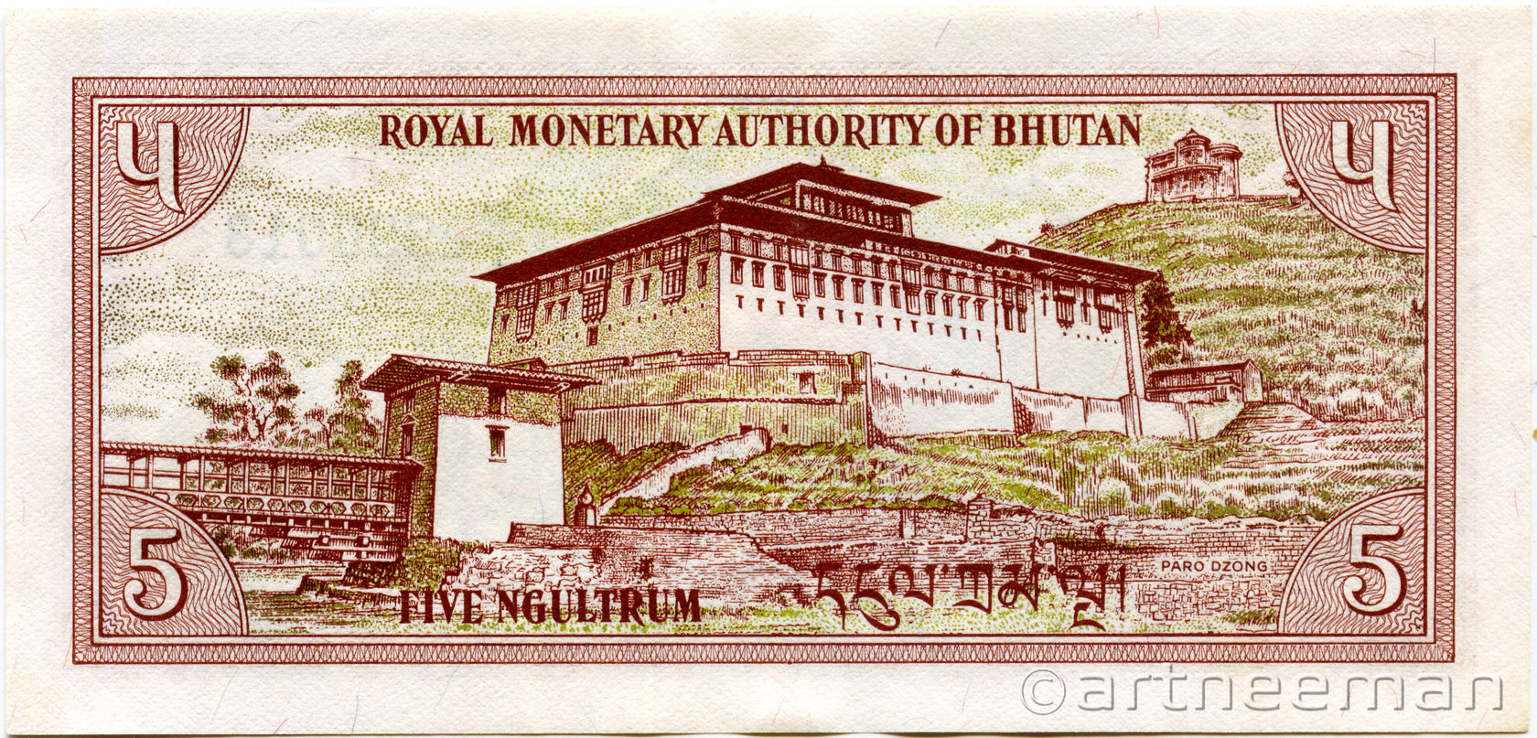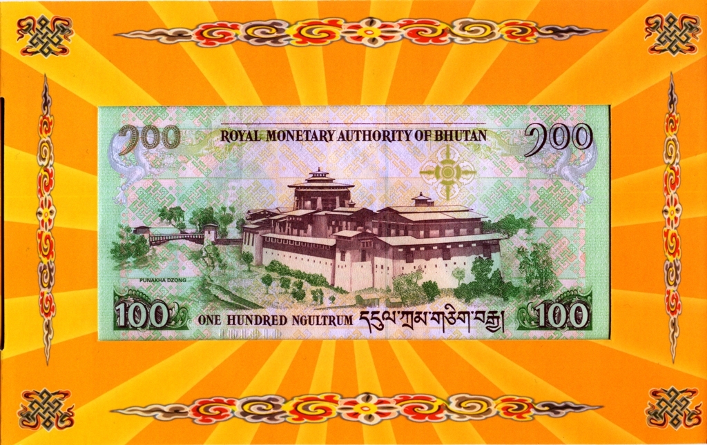 Оборотная сторона: Пунакха-дзонг («Дворец великого счастья») — крепость-монастырь в Бутане, который является основным зданием в городе Пунакха. Дзонг Пунакха имеет большое культурно-историческое значение, с давних времён являлся столицей исторической провинции Пунакха.
