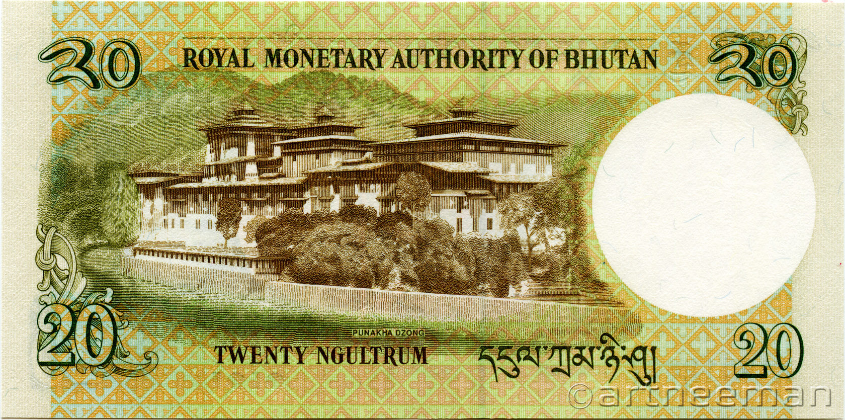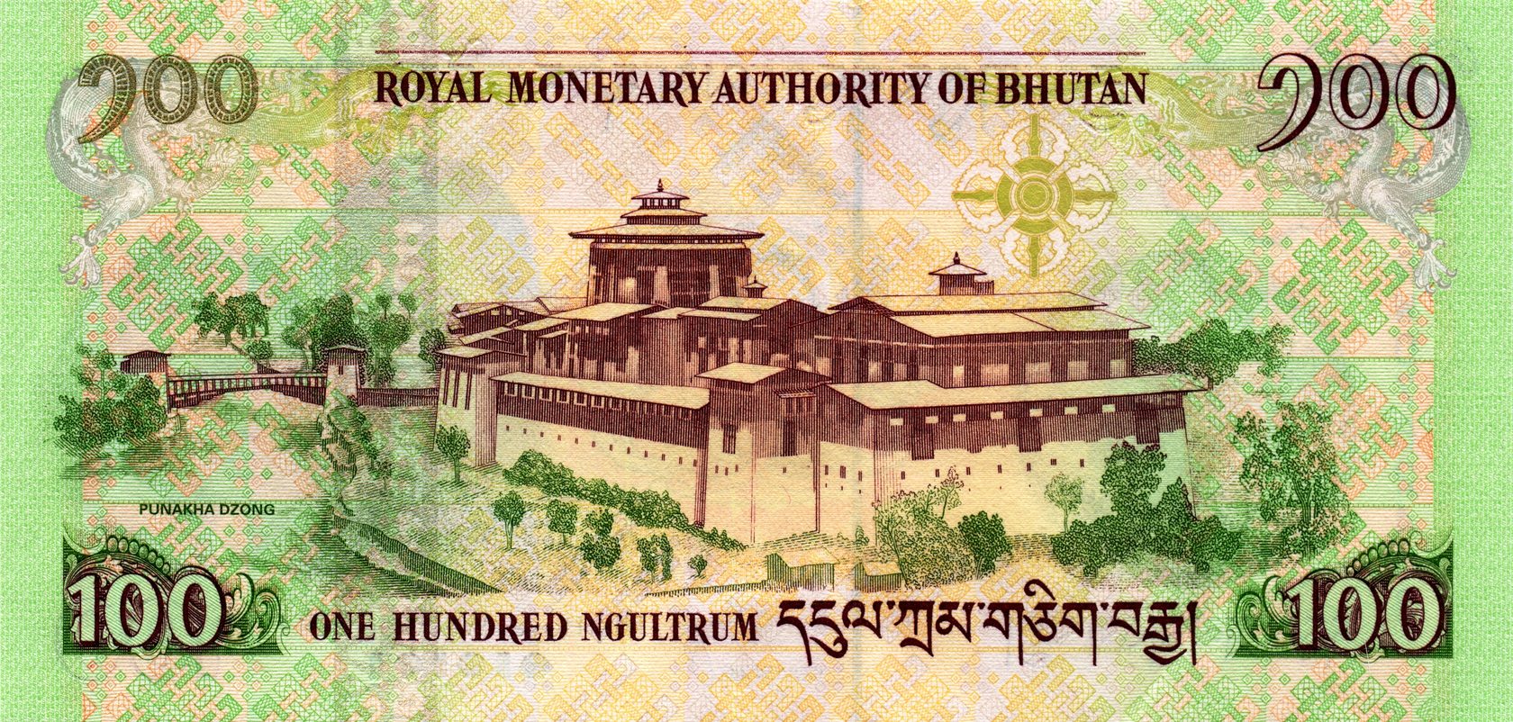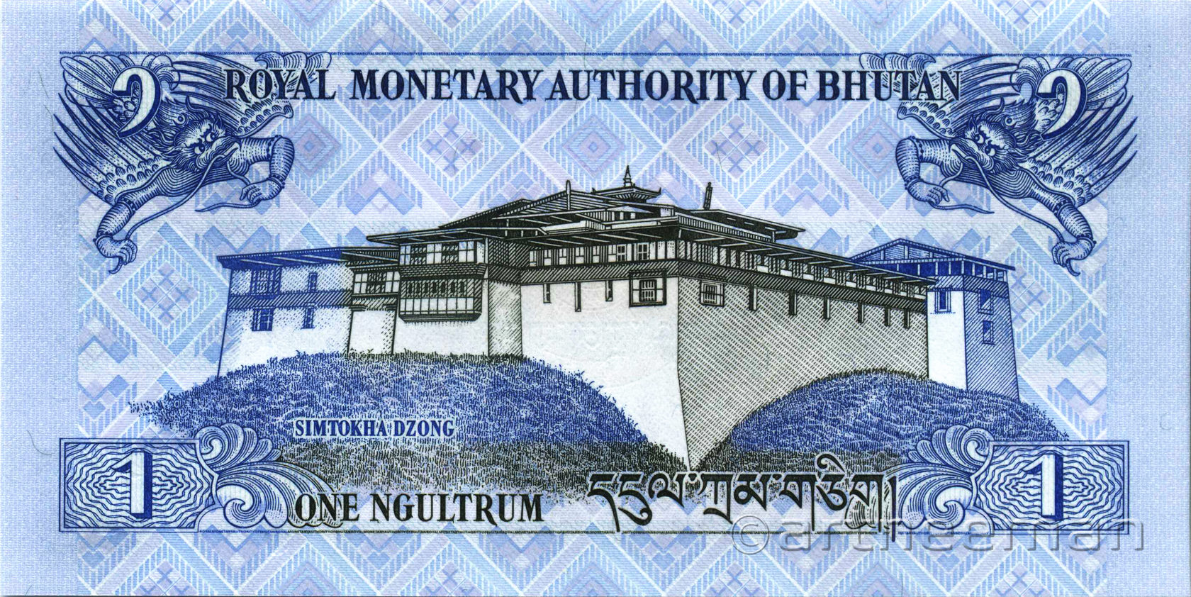 Оборотная сторона: Пунакха-дзонг («Дворец великого счастья») — крепость-монастырь в Бутане, который является основным зданием в городе Пунакха. Дзонг Пунакха имеет большое культурно-историческое значение, с давних времён являлся столицей исторической провинции Пунакха.