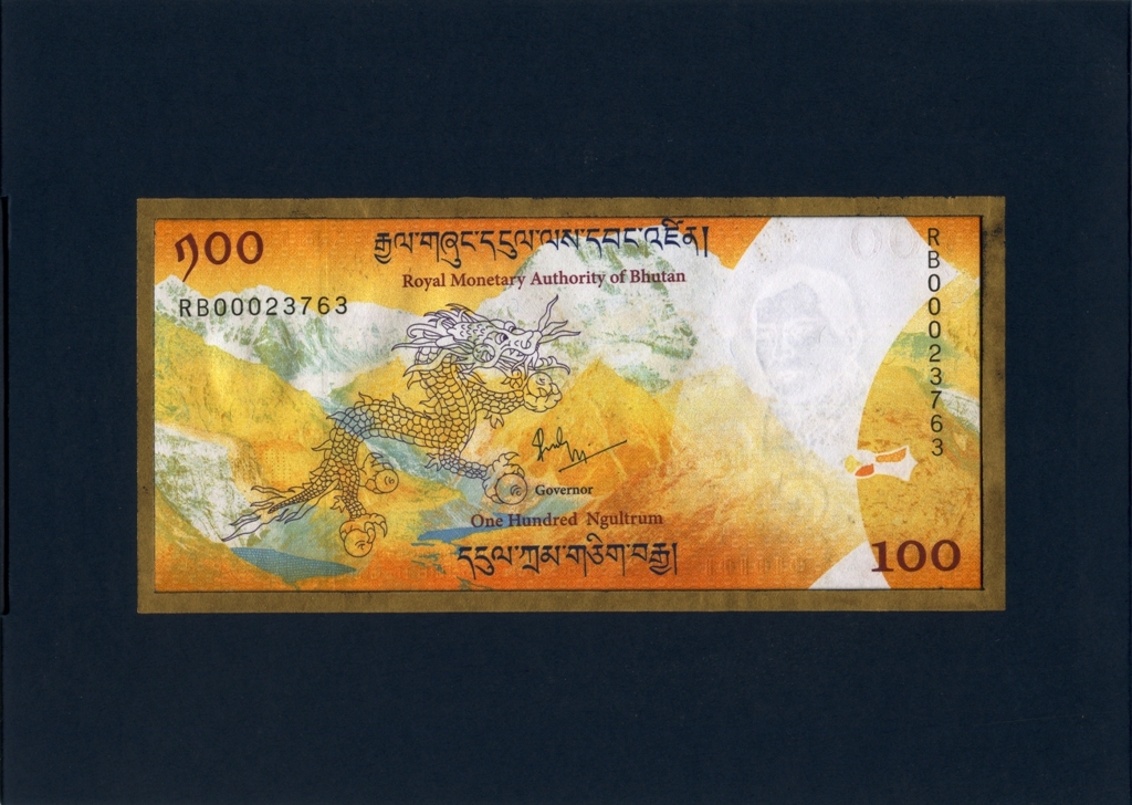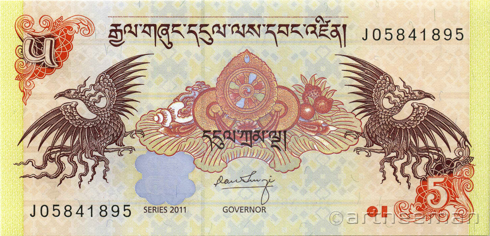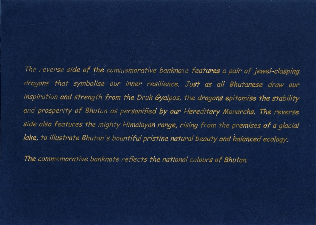 Оборотная сторона: Громовой дракон. На языке дзонгкха Бутан известен как Друкюль, что переводится как «Земля Громового Дракона». Короли Бутана называют себя Друк Гьялпо («Король Дракона»), народ Бутана называет себя Друкпа , что означает «Народ Дракона».