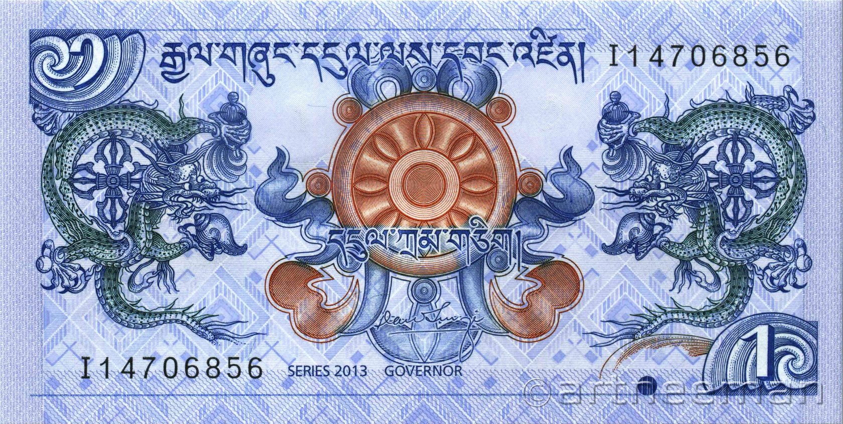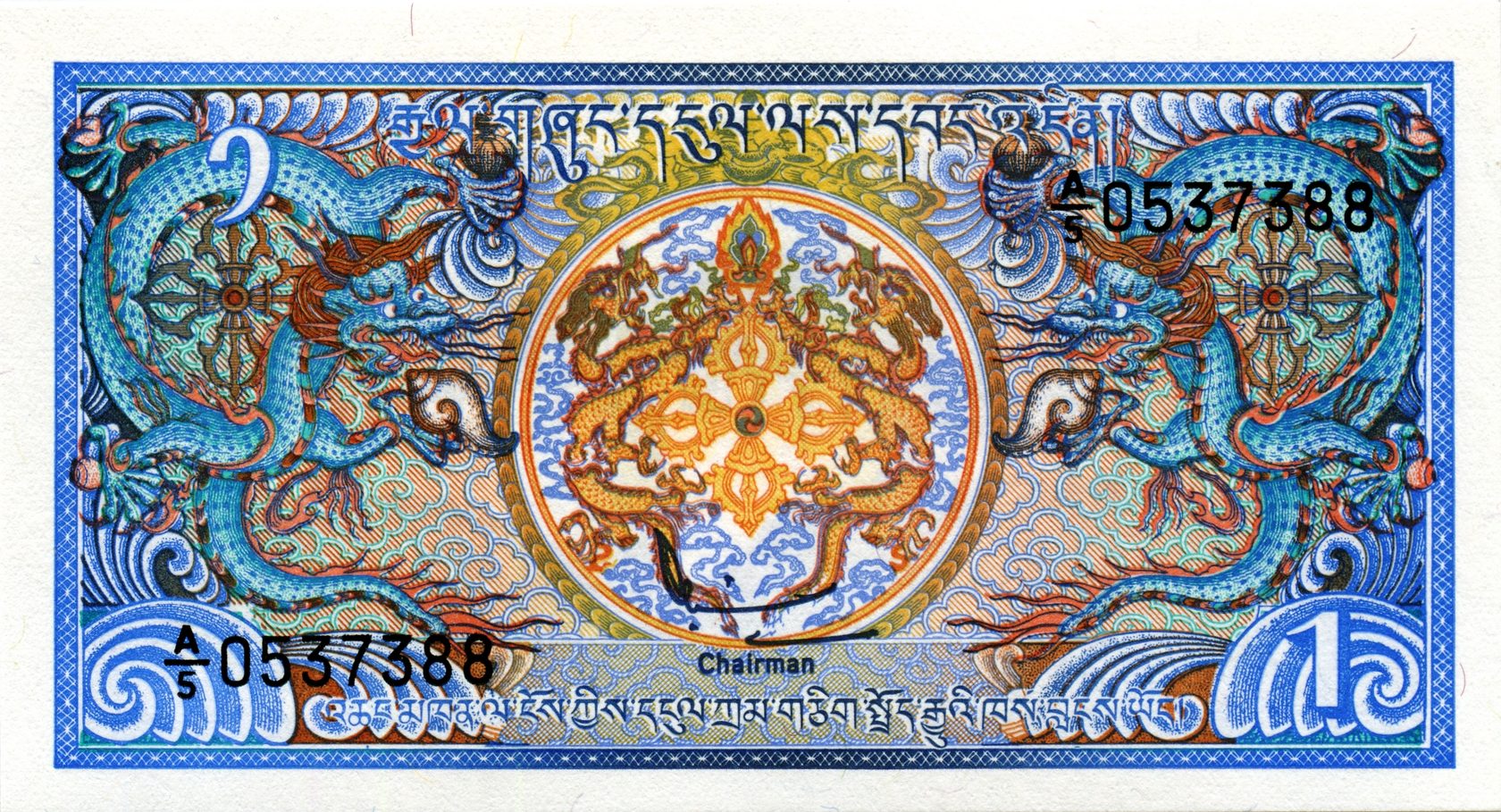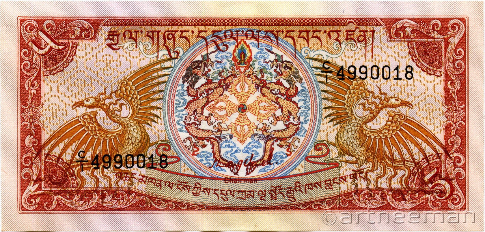 Оборотная сторона: Громовой дракон. На языке дзонгкха Бутан известен как Друкюль, что переводится как «Земля Громового Дракона». Короли Бутана называют себя Друк Гьялпо («Король Дракона»), народ Бутана называет себя Друкпа , что означает «Народ Дракона».