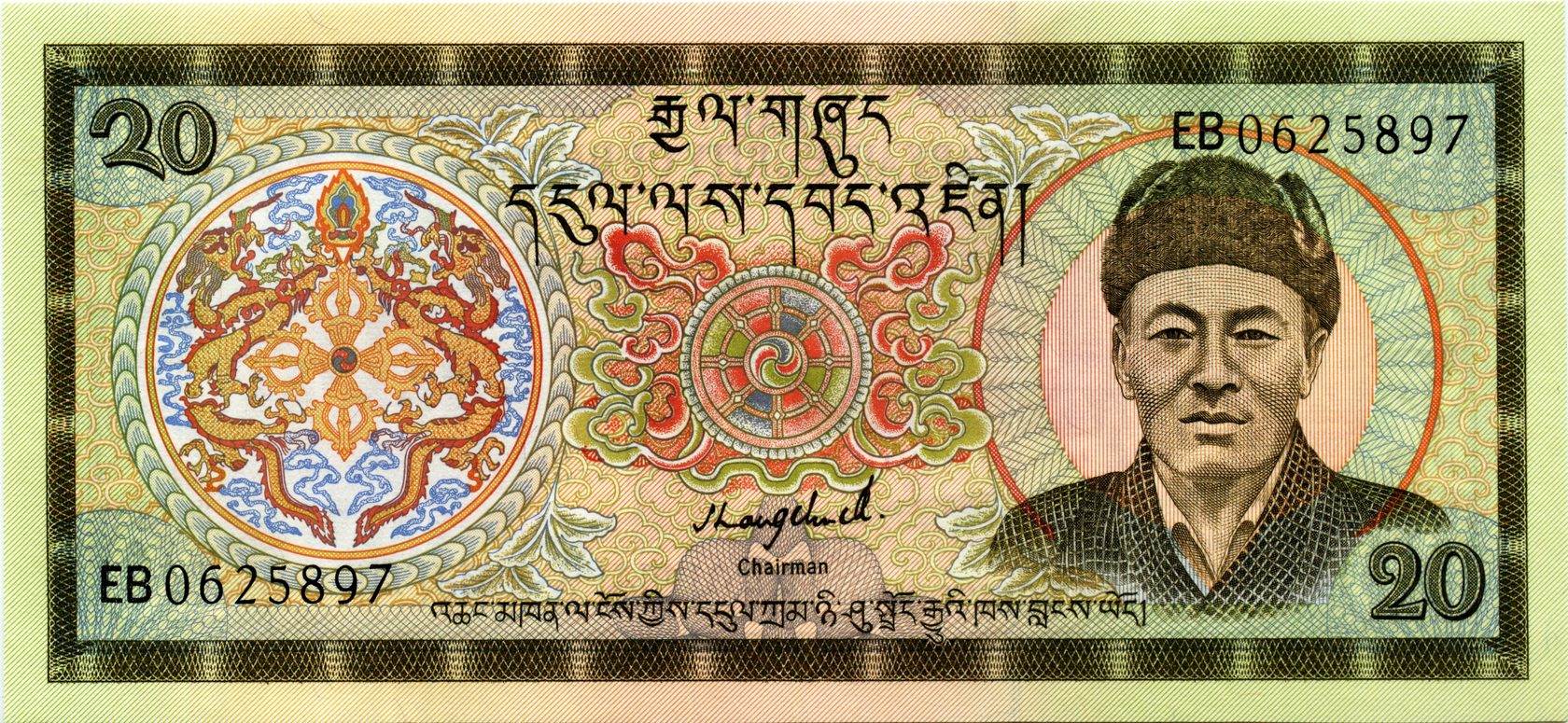 Лицевая сторона: Джигме Дорджи Вангчук (2 мая 1929 — 21 июля 1972) — третий король Бутана с 1952 по 1972. Вступил на трон после смерти своего отца, второго короля Джигме Вангчук из династии Вангчуков. Он выбрал путь медленной модернизации и сделал шаги по выходу страны из мировой изоляции.
