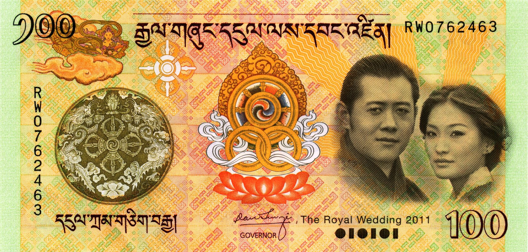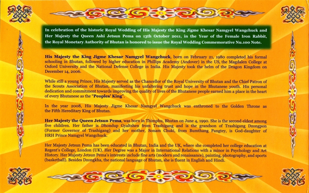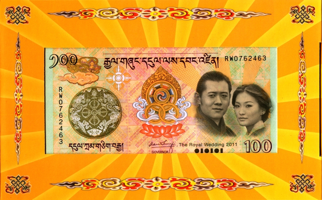 Памятная банкнота в ознаменовании Королевской свадьбы 13 октября 2011 года, короля Джигме Кхесара Намгьела Вангчука и королевы Аши Джецун Пема Вангчук.