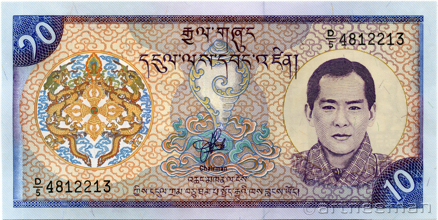 Лицевая сторона: Королевская эмблема - дзонг-кэ. Портрет Джигме Сингье Вангчук — четвёртый король Бутана с 1972г. В 2006 король отрёкся от престола в пользу своего сына Джигме Кхесар Намгьял Вангчук ранее объявленного срока.