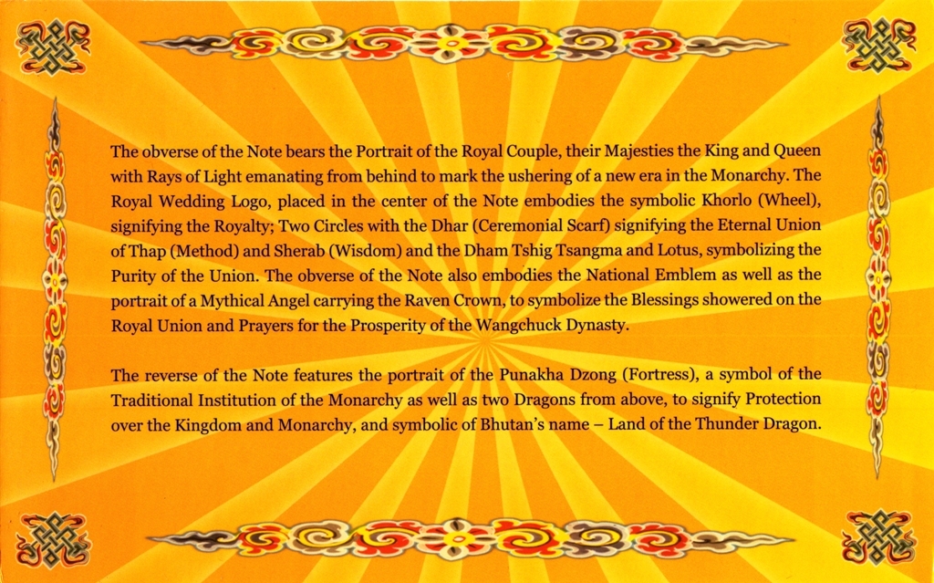 Лицевая сторона: Мифический ангел с короной ворона; государственный герб; логотип королевской свадьбы, состоящий из хорло (колеса), обозначающего королевскую власть, кружков с дхар (церемониальный шарф), обозначающих вечный союз тап (метод) и шераб (мудрость), и дхам тшиг цангма и лотос, символизирующих чистоту единства; Король Джигме Кхесар Намгьял Вангчук и королева Аши Джецун Пема Вангчук.