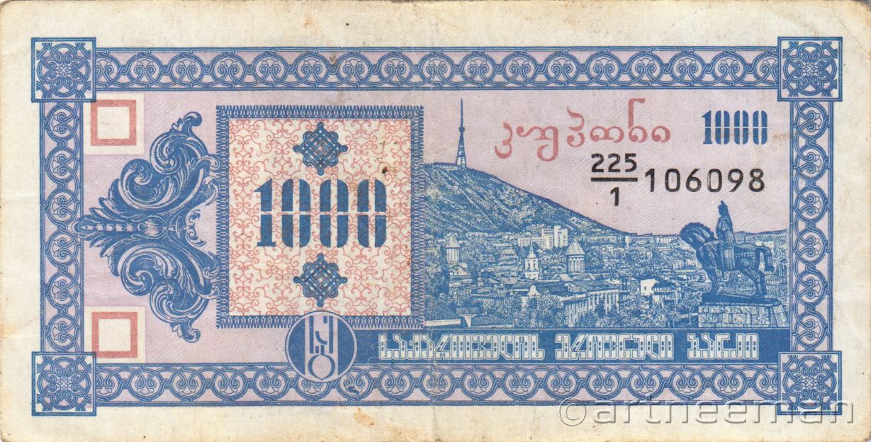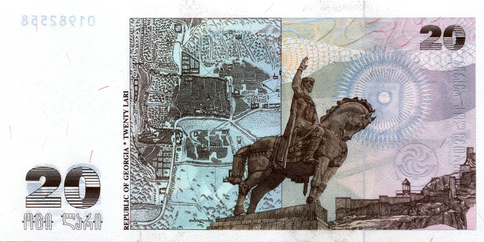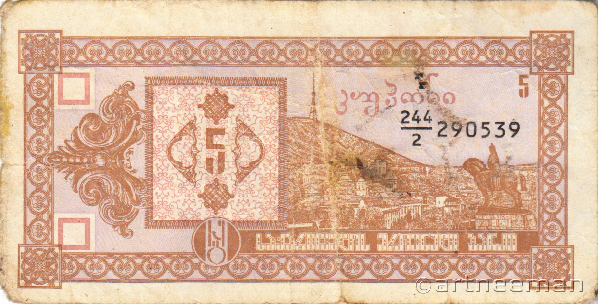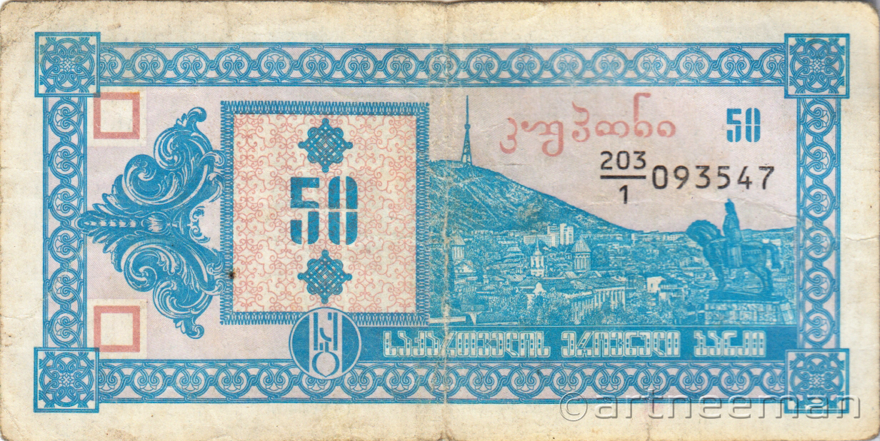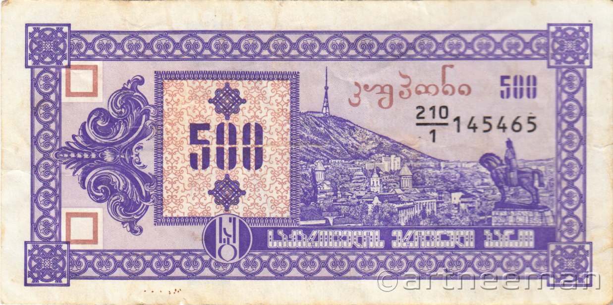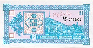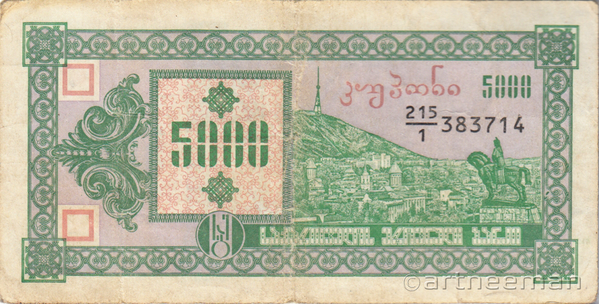 Лицевая сторона (на всех банкнотах): Вид на старый Тбилиси со скульптурой царя Вахтанга Горгасали, основателя Тбилиси