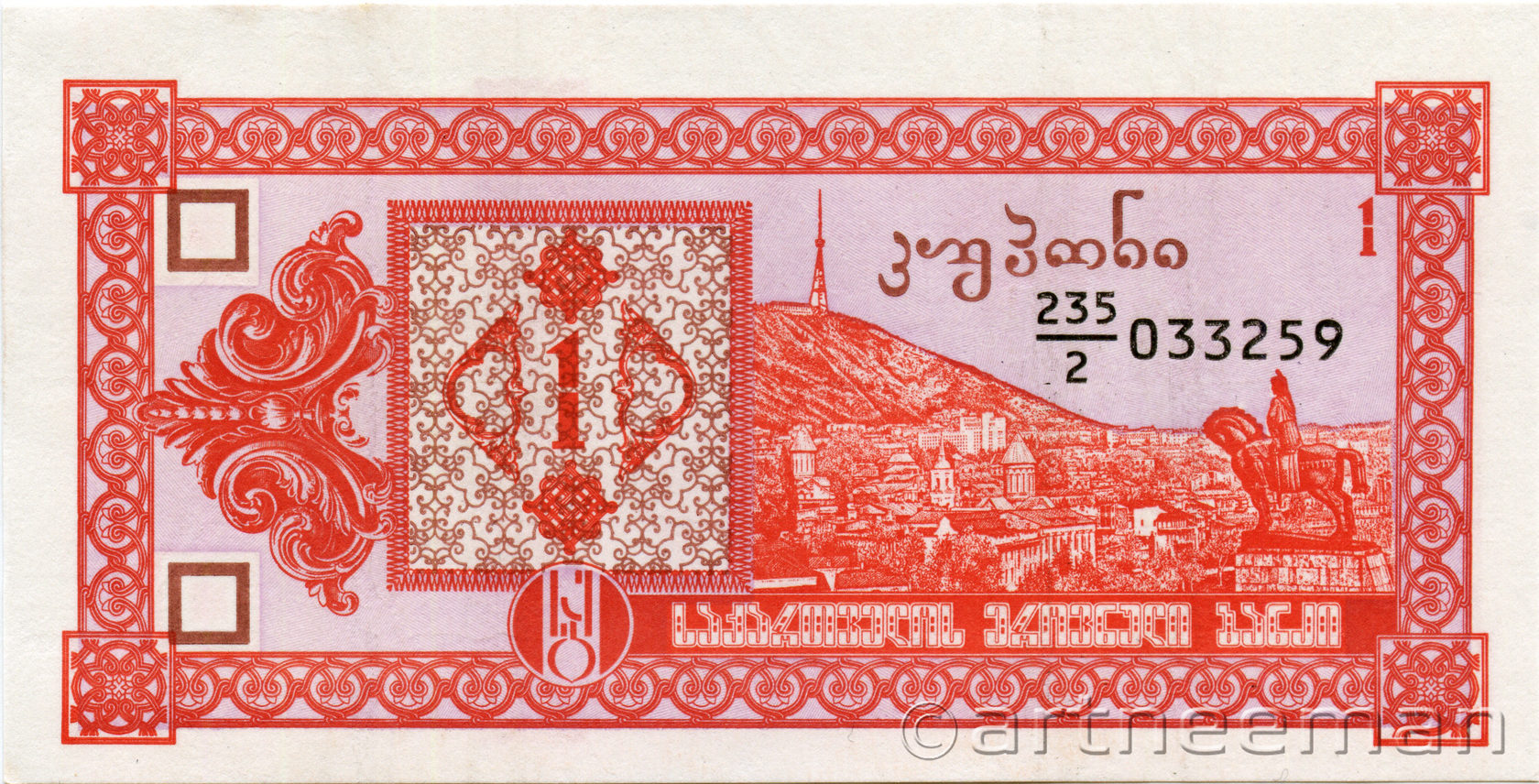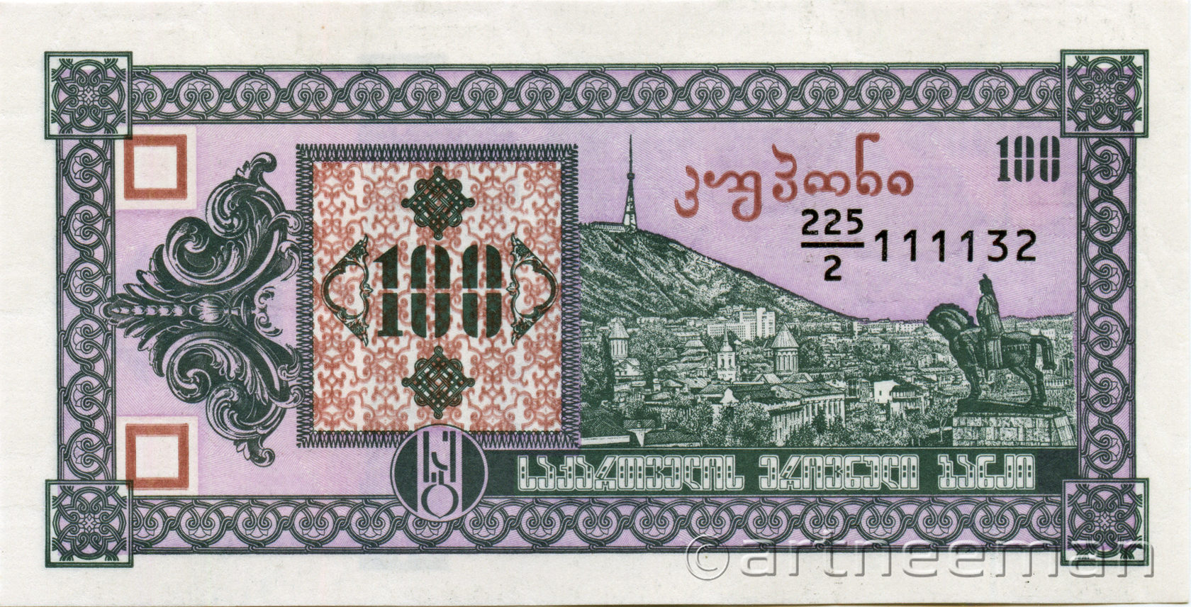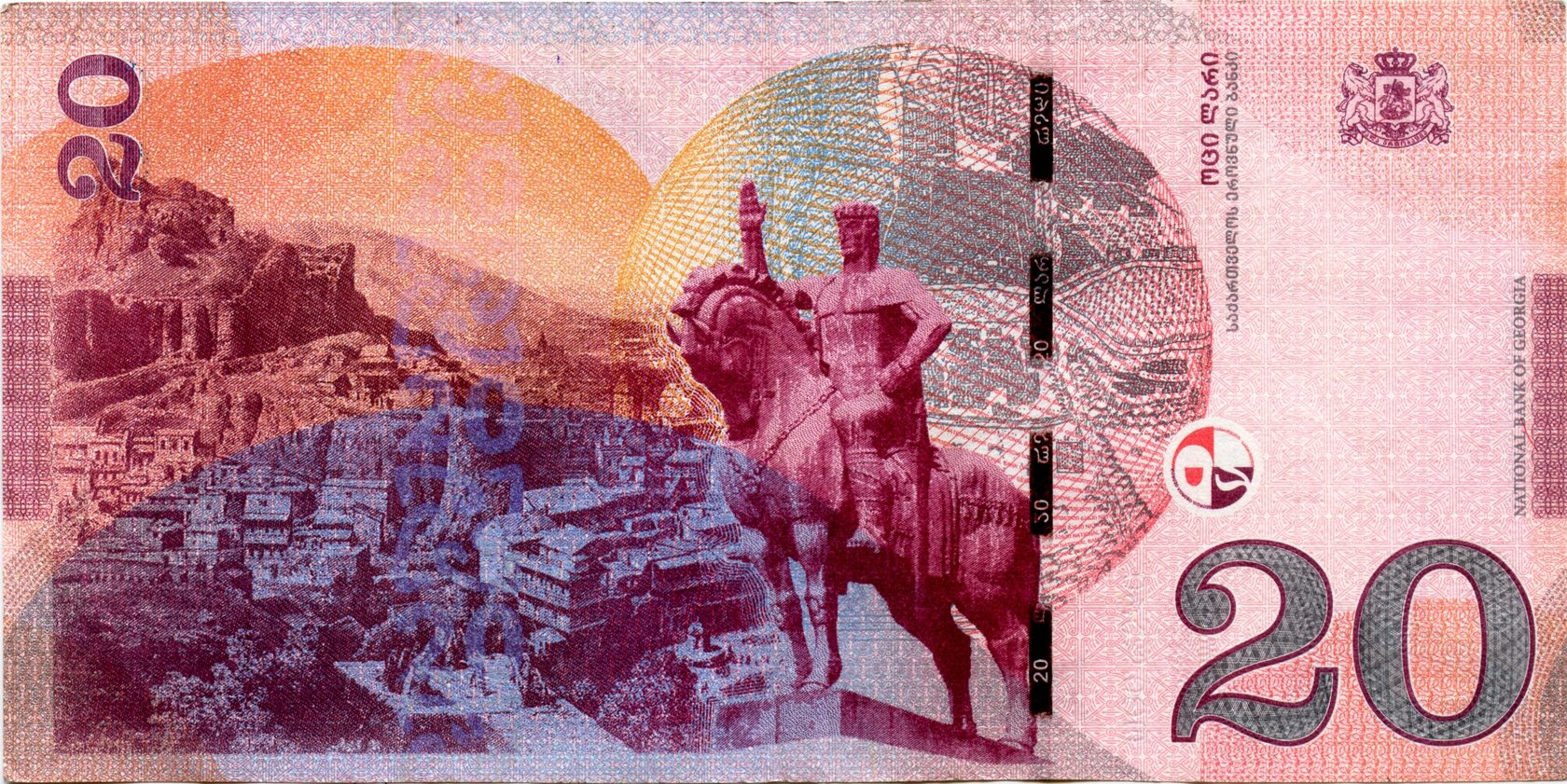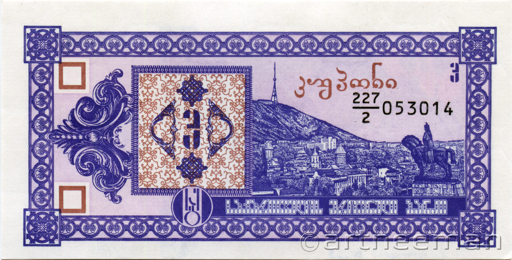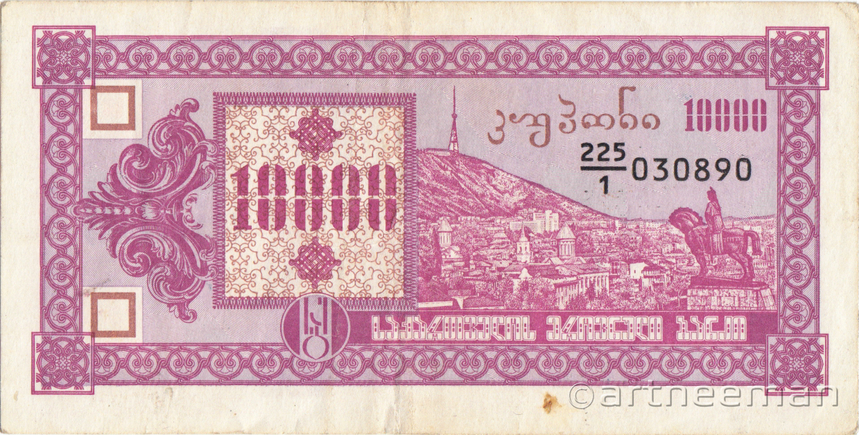 Лицевая сторона (на всех банкнотах): Вид на старый Тбилиси со скульптурой царя Вахтанга Горгасали, основателя Тбилиси