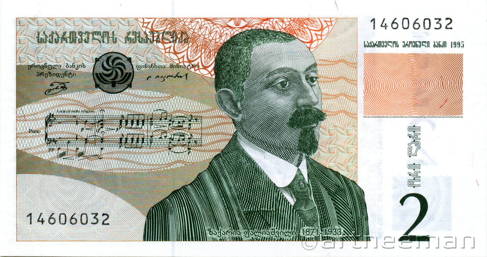 Лицевая сторона: Портрет грузинского композитора Захария Палиашвили (1871—1933), нотный фрагиент увертюры из его оперы «Абессалом и Этери». Захарий Петрович Палиашвили (1871-1933) — выдающийся грузинский композитор и педагог, музыкально-общественный деятель, крупнейший представитель грузинской классической музыки. В 1925 году получил высокое звание народного артиста Грузинской ССР.