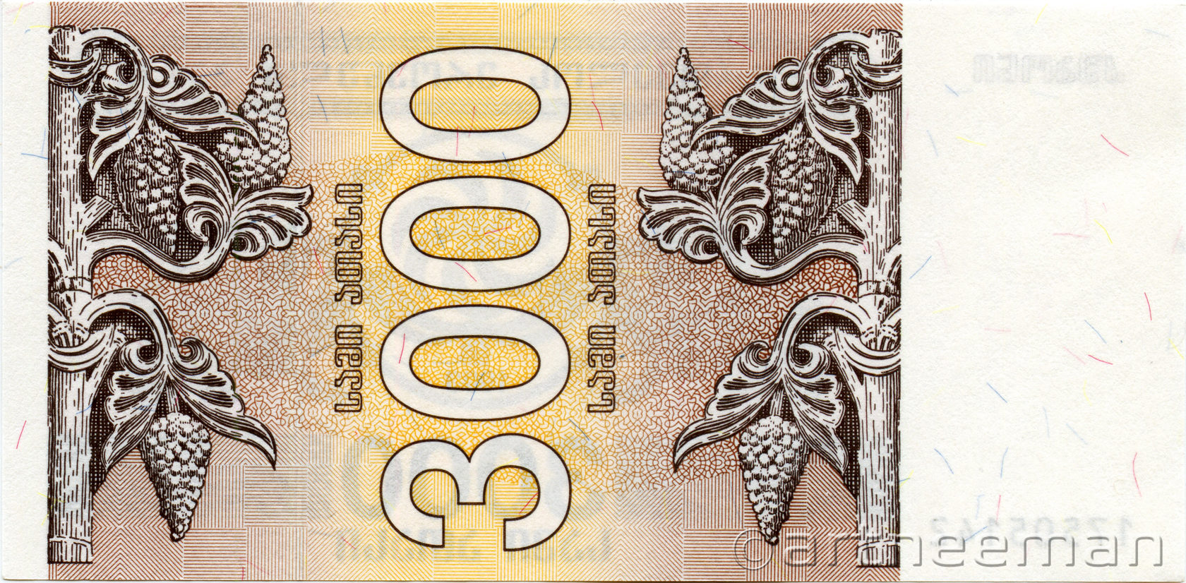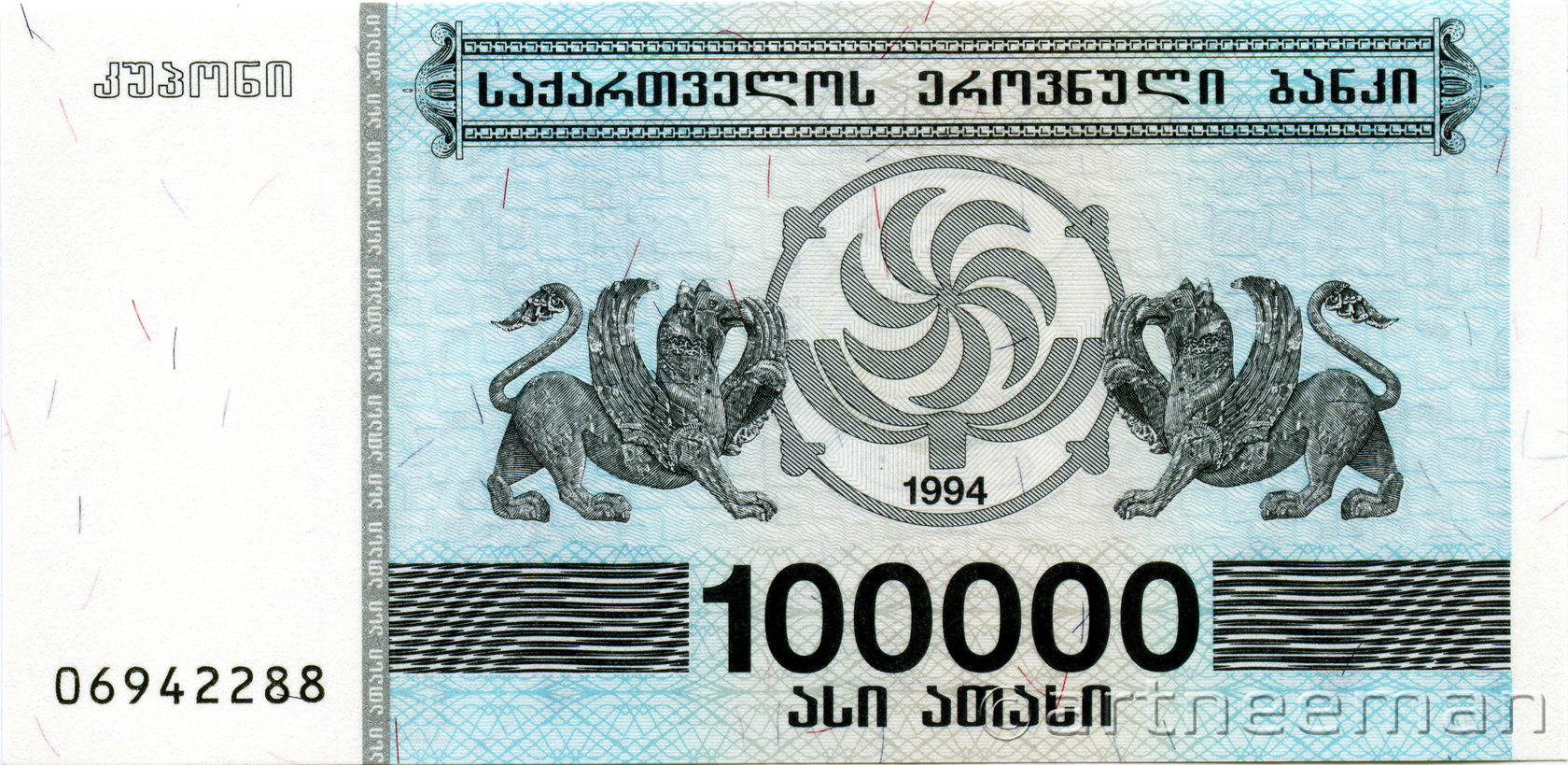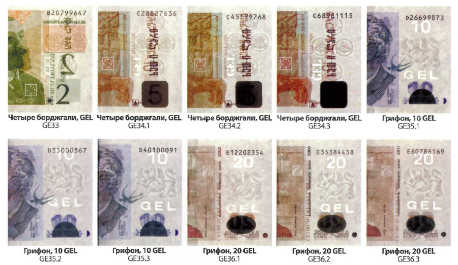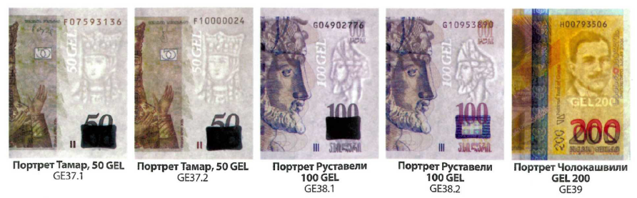 Лицевая сторона (на всех банкнотах): Древний Грузинский символ солнца "Горджгали" и Древо Жизни, между двумя мифическими существами – Грифонами.