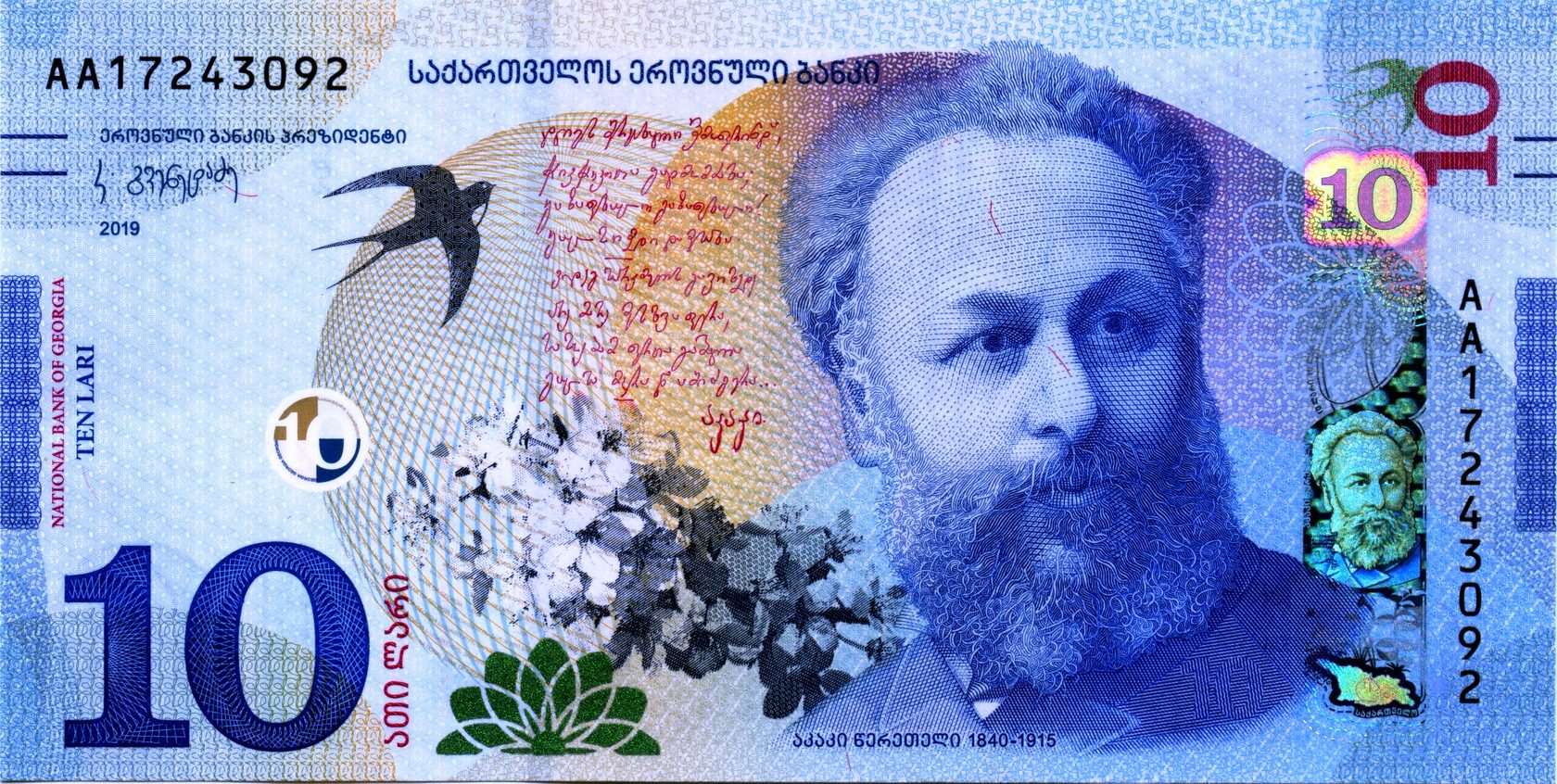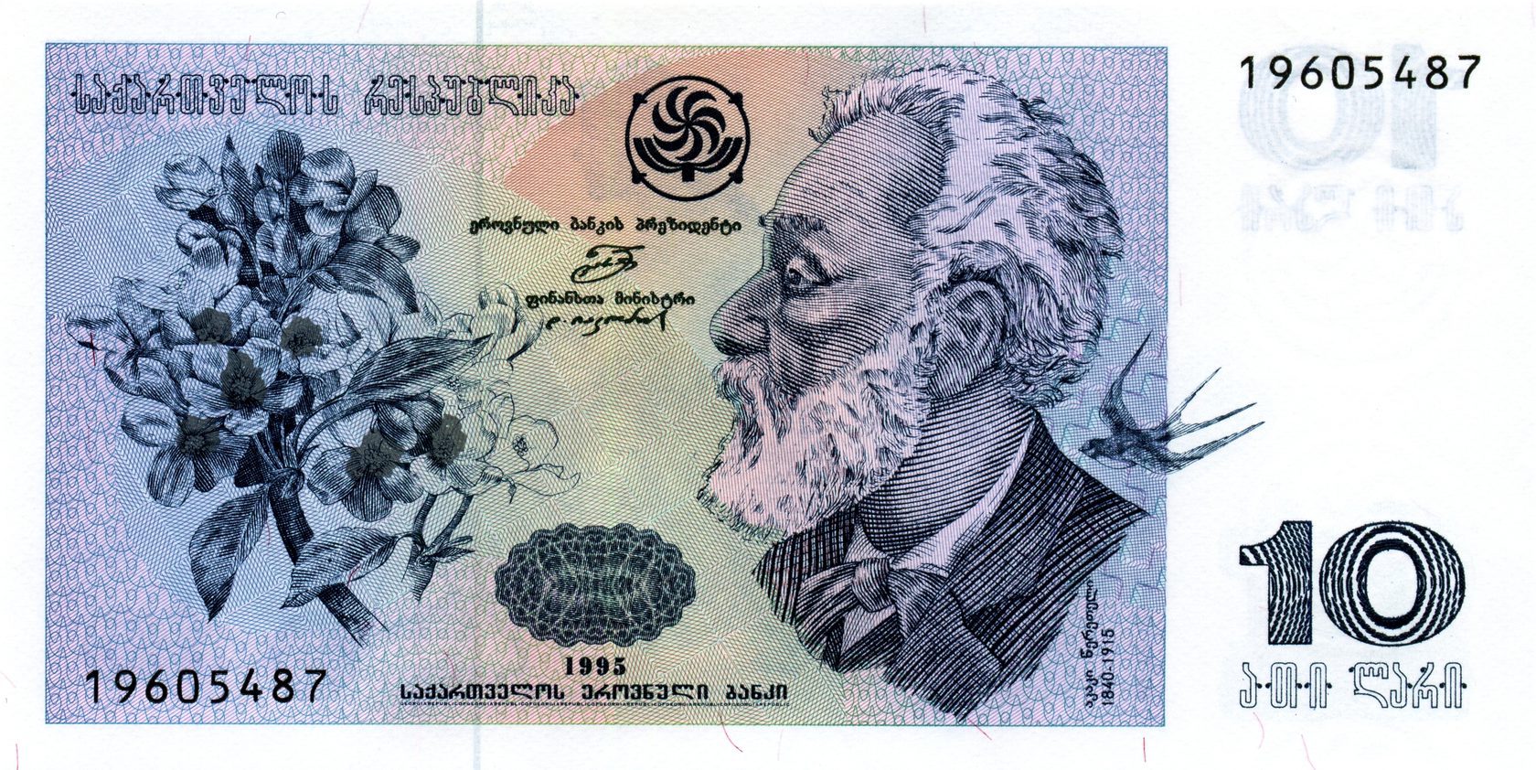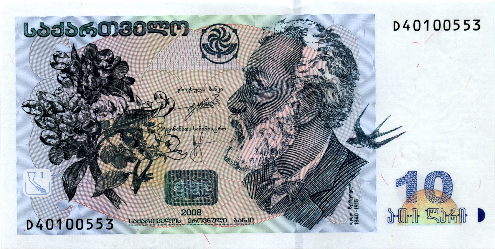 Лицевая сторона: Портрет грузинского поэта и общественного деятеля Акакия Церетели, на фоне изображения ласточки и цветущей ветки.