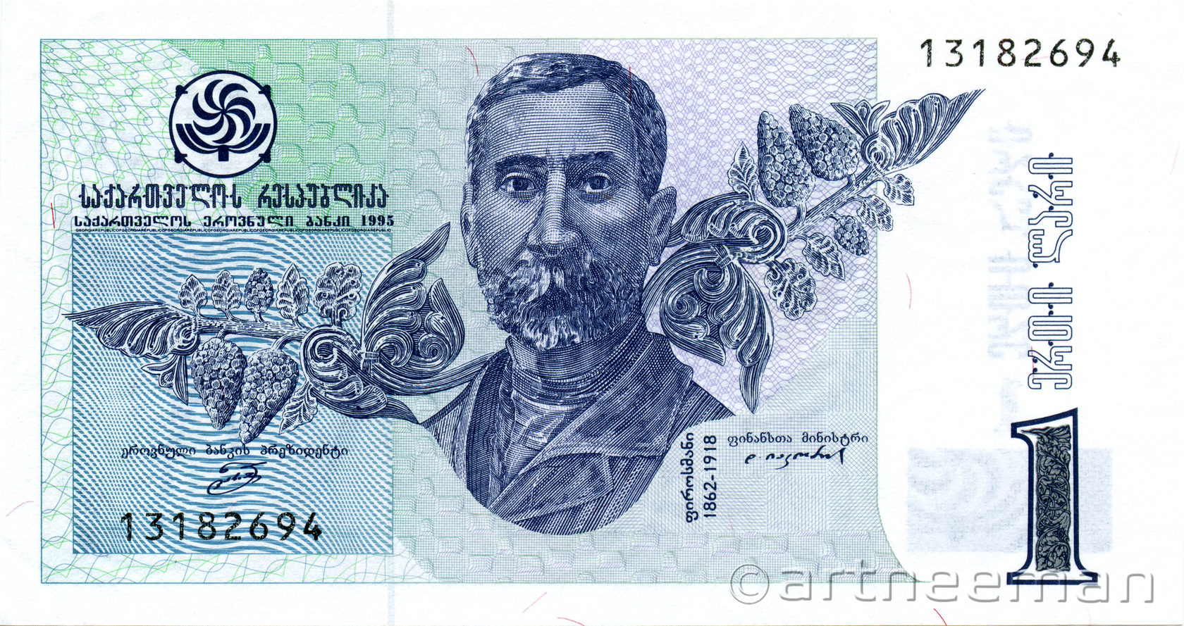 Лицевая сторона: Портрет грузинского художника-примитивиста Нико Пиросмани на фоне гроздьев винограда. Нико Пиросмани (настоящее имя Николай Асланович Пиросманашвили; 1862-1918) — известный грузинский художник XX века, самоучка, представитель примитивизма. Наибольшие собрания работ Пиросманашвили находятся в Государственном музее искусства народов Востока и в Третьяковской галерее в Москве.