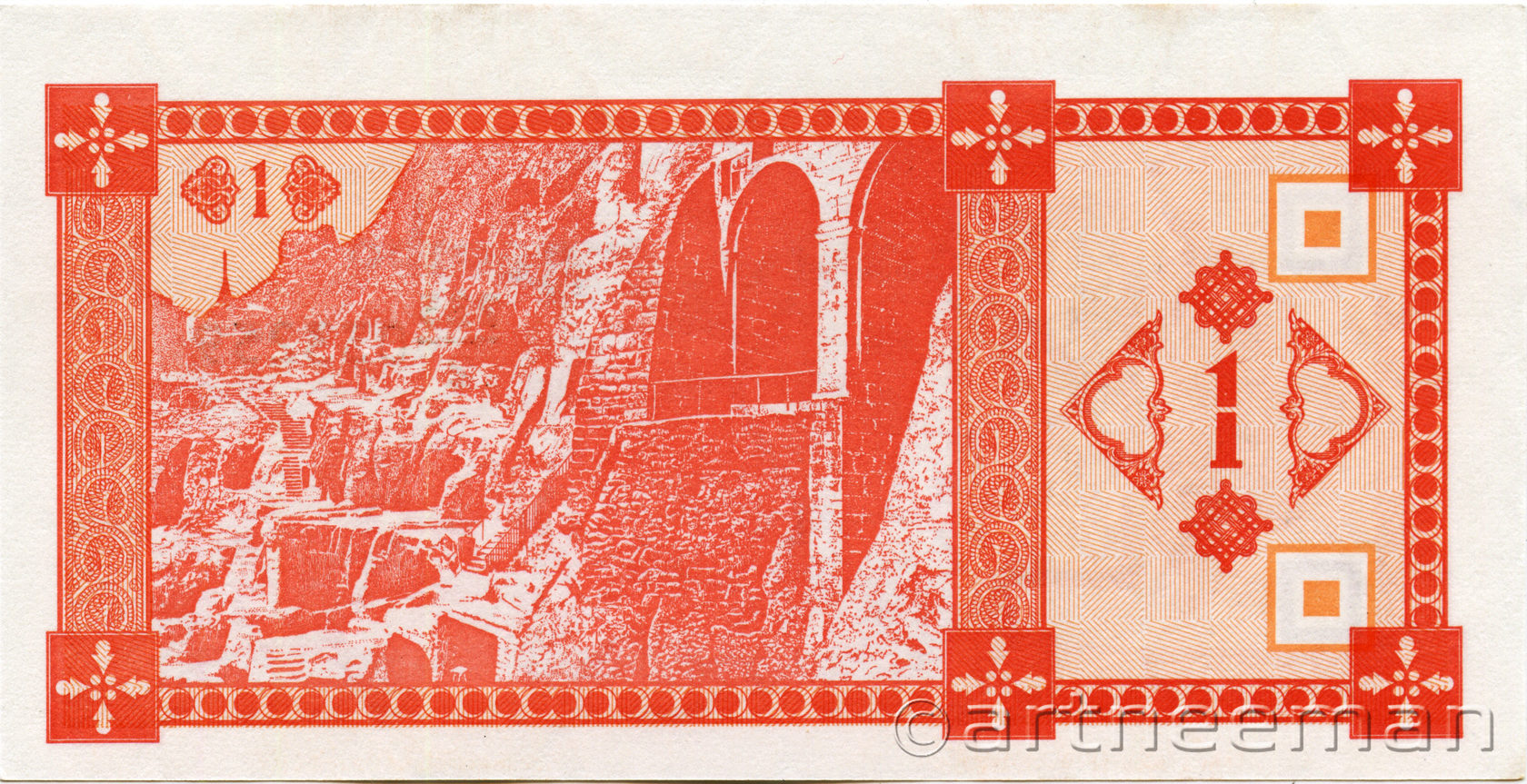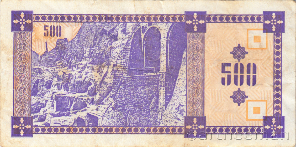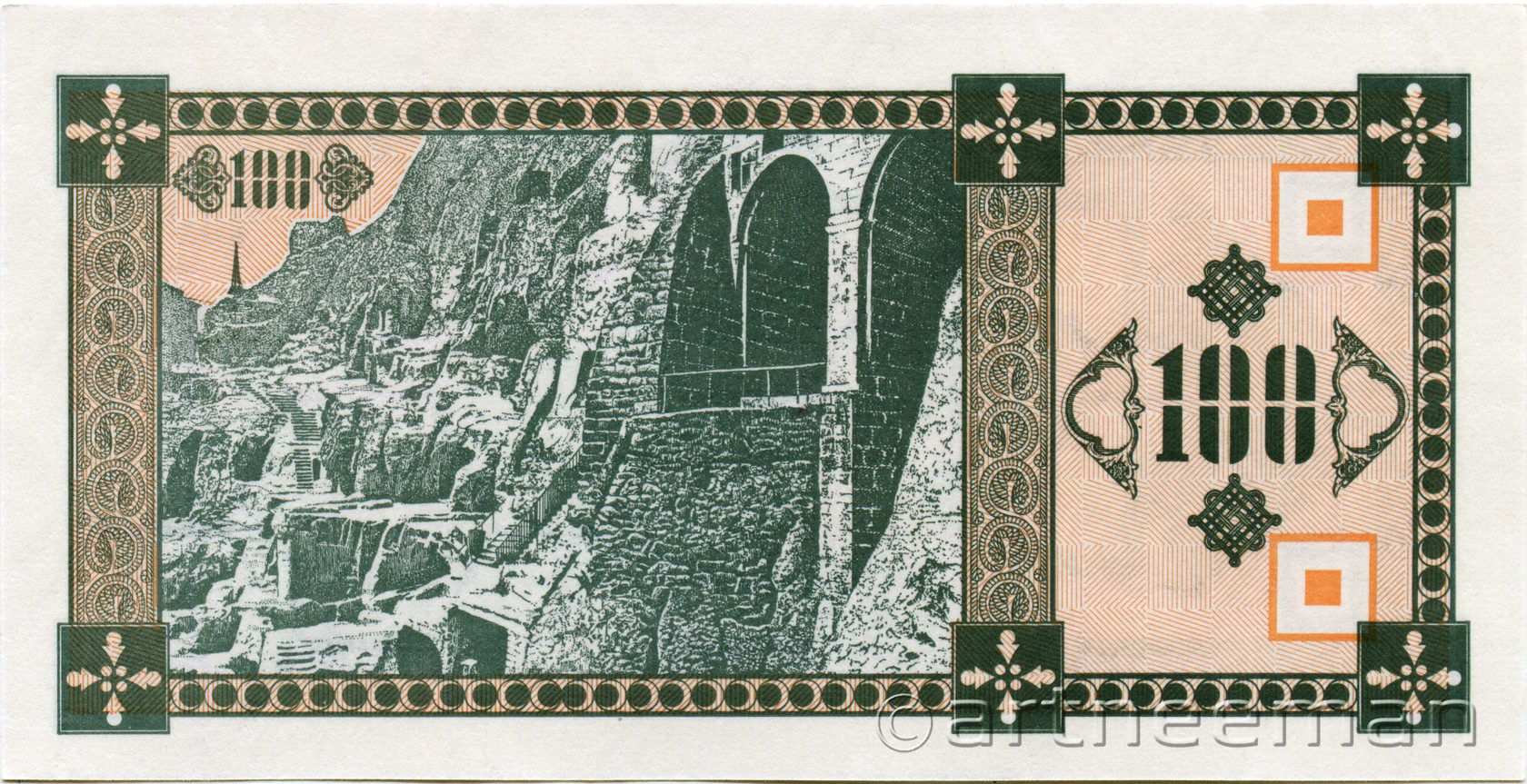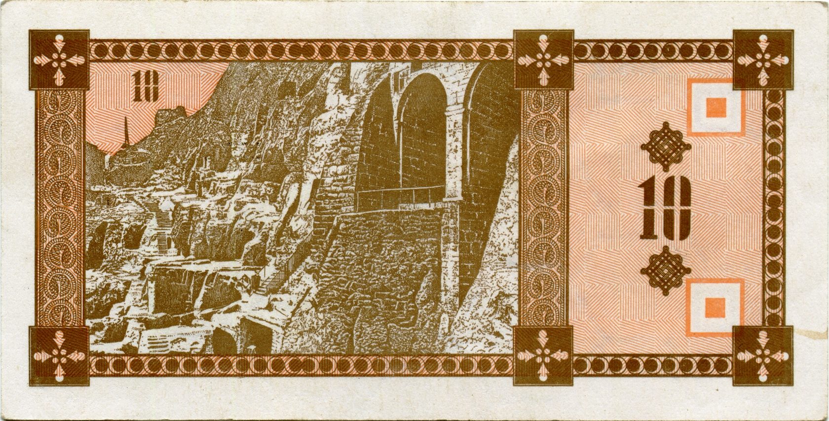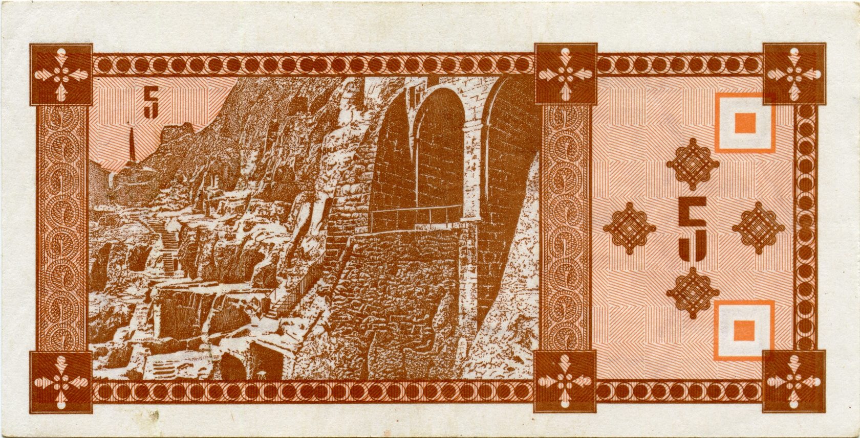 Оборотная сторона (на всех банкнотах): Пещерный город Вардзия в горе Эрушели около посёлка Аспиндза