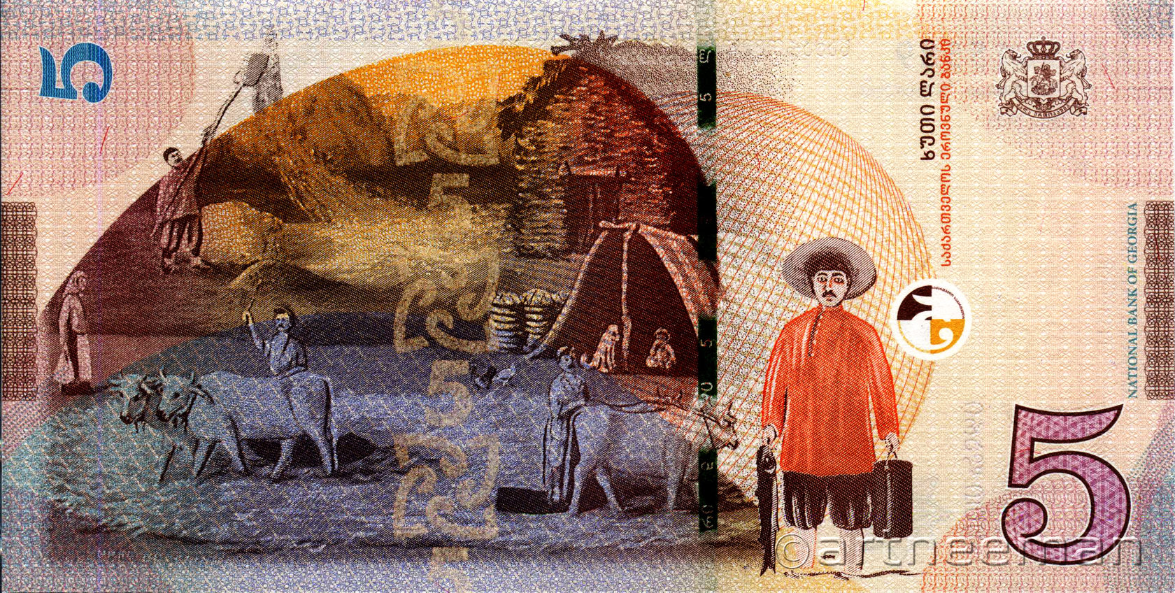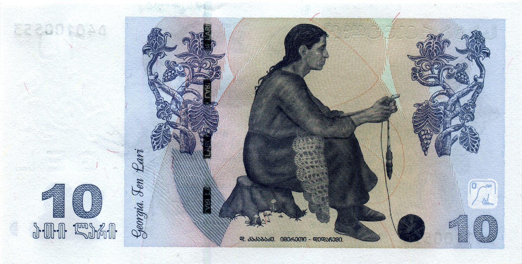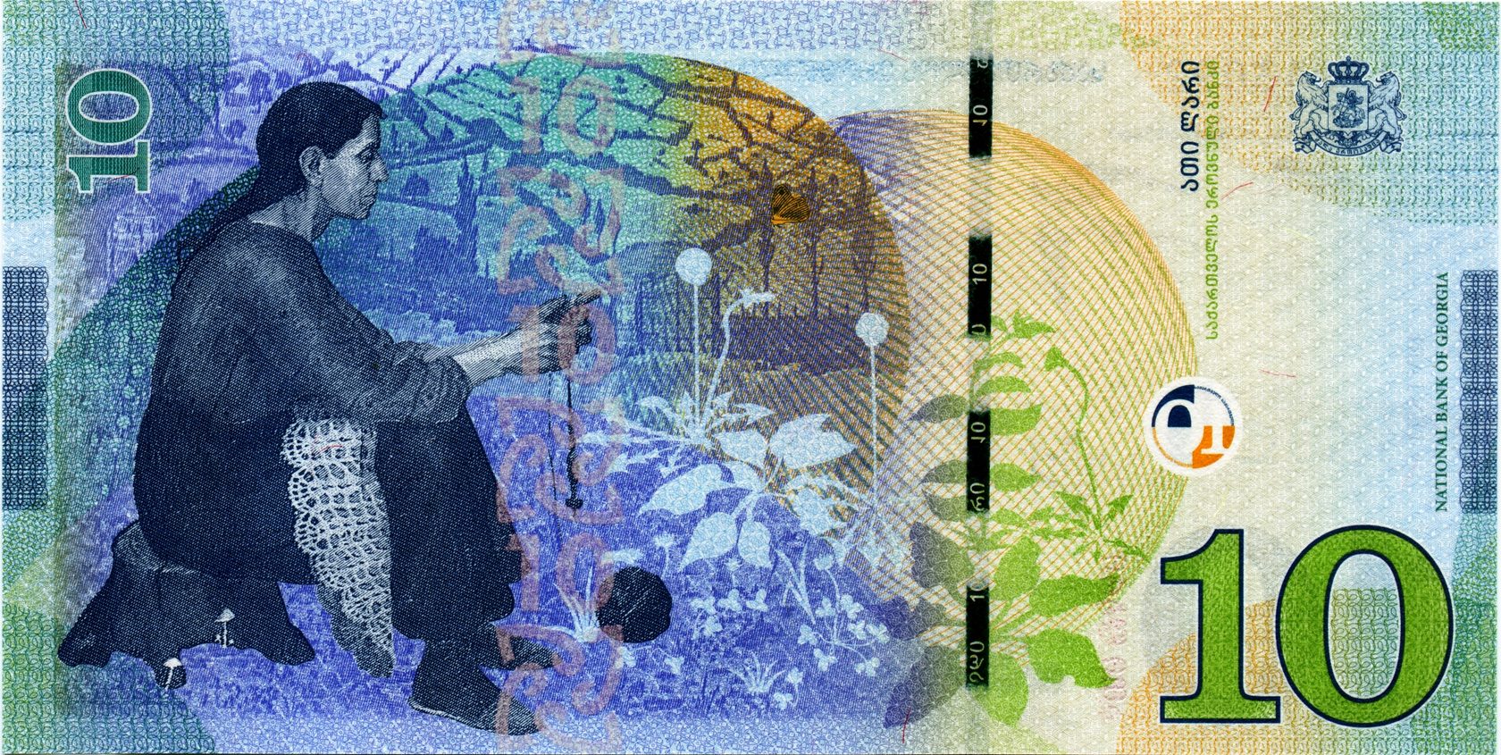 Оборотная сторона: Произведение известного грузинского художника Давида Какабадзе „Имеретия-мать моя“ и Государственный герб Грузии.