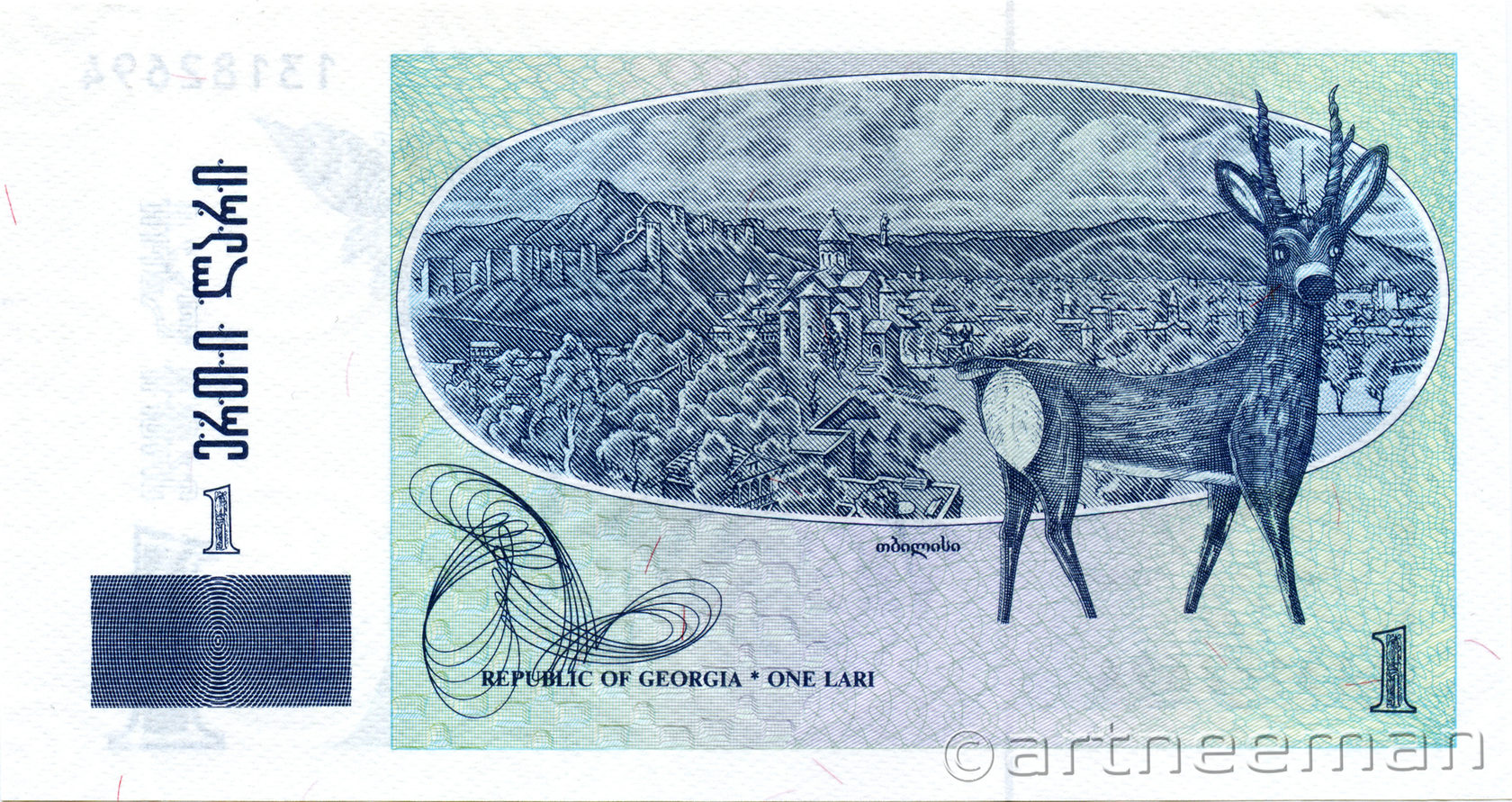 Оборотная сторона: Панорама старого Тбилиси; изображение косули с картины Пиросмани "Косуля на фоне пейзажа".