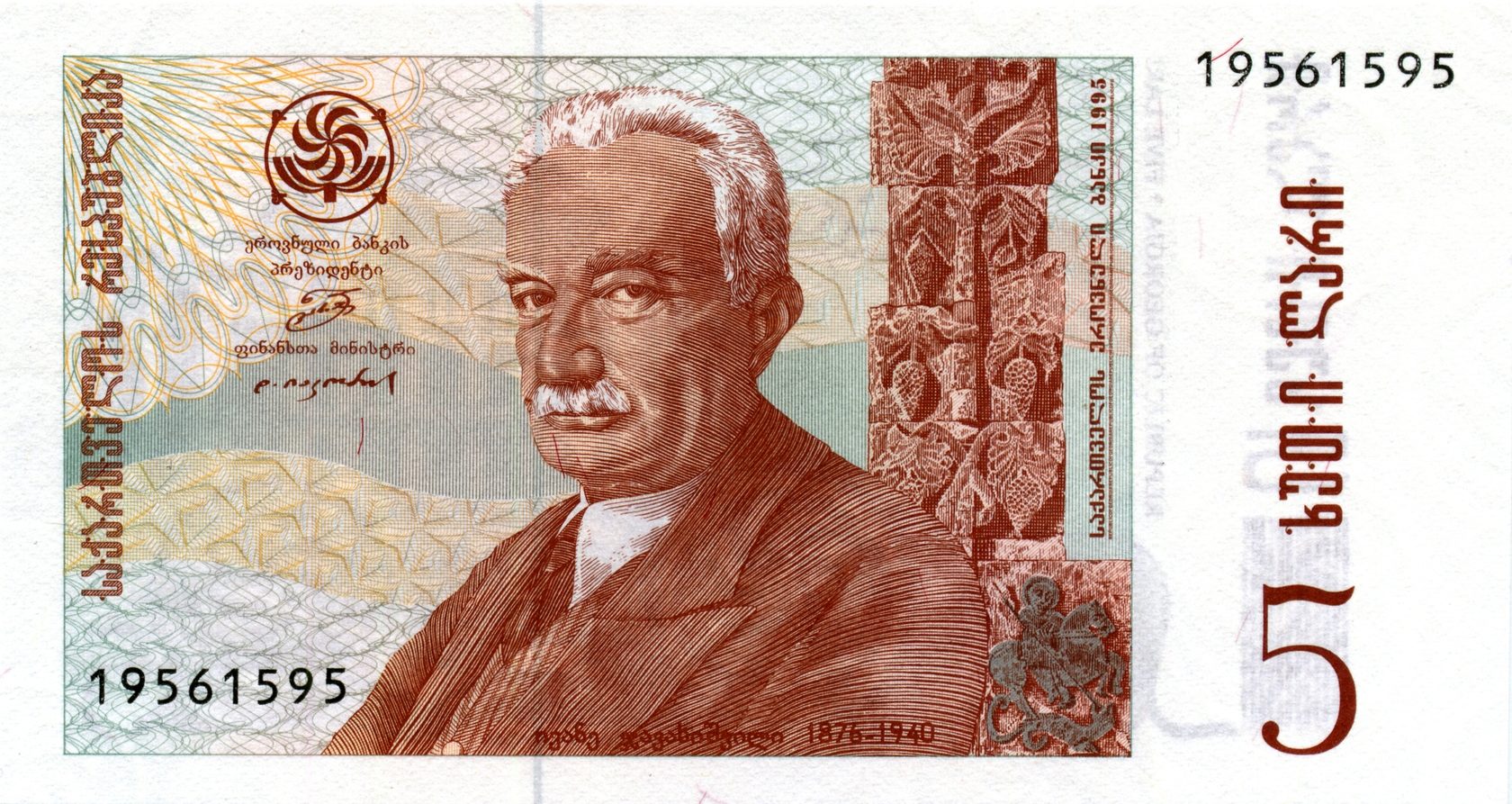 Лицевая сторона: Портрет грузинского академика Иванэ Джавахишвили. Иванэ Джавахишвили (1876-1940) — знаменитый грузинский историк. В 1939 году стал академиком Академии наук СССР. Является основателем Тбилисского университета, который в настоящее время носит его имя. Посмертно удостоен Сталинской премии в 1947 году.