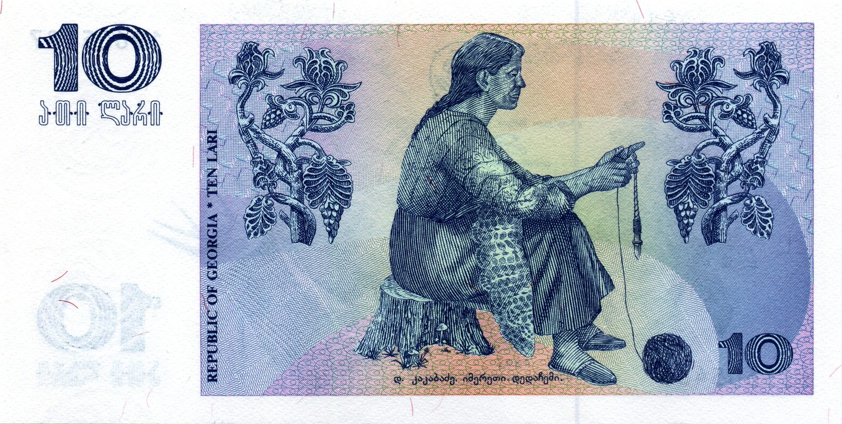 Оборотная сторона: Фрагмент картины грузинского художника Давида Какабадзе «Имеретия — мать моя», по краям стилизованные изображения виноградной лозы.