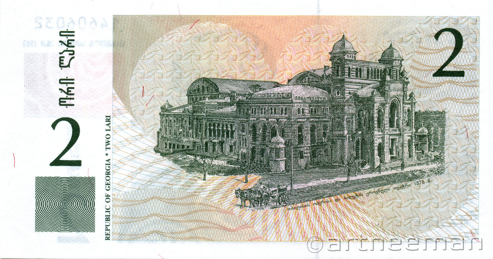 Оборотная сторона: Здание Государственного академического театра оперы и балета им. Палиашвили в Тбилиси.