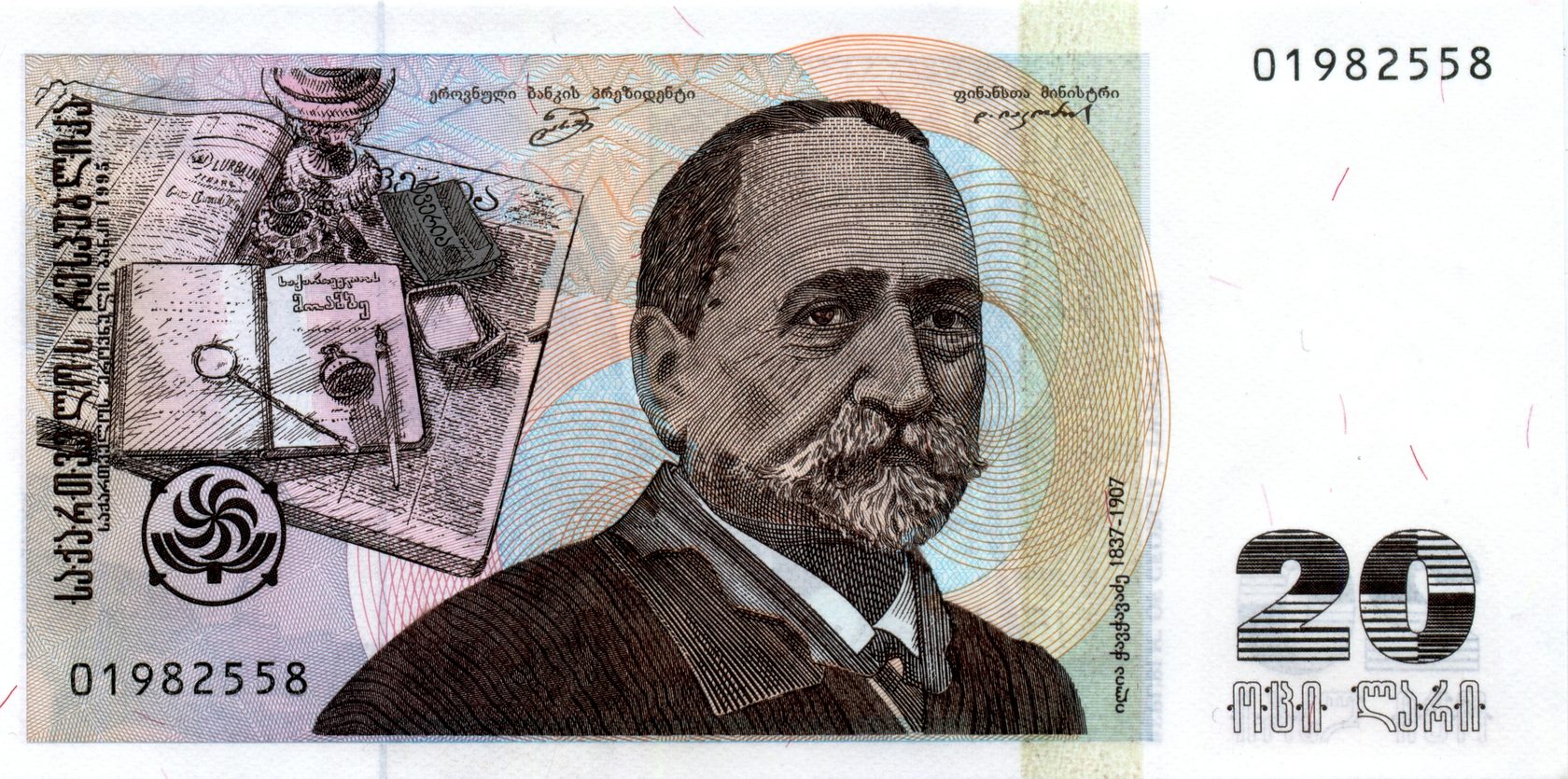 Лицевая сторона: Портрет великого грузинского писателя и общественного деятеля Ильи Чавчавадзе с надписью "ილია ჭავჭავაძე, 1837-1907"; Издательство газеты "Иверия"; Издаваемый Ильей Чавчавадзе Журнал "Сакартвелос моамбе" и газета "Иверия ", подпись Ильи Чавчавадзе и его личные вещи - лупа, часы, перо и чернильница.