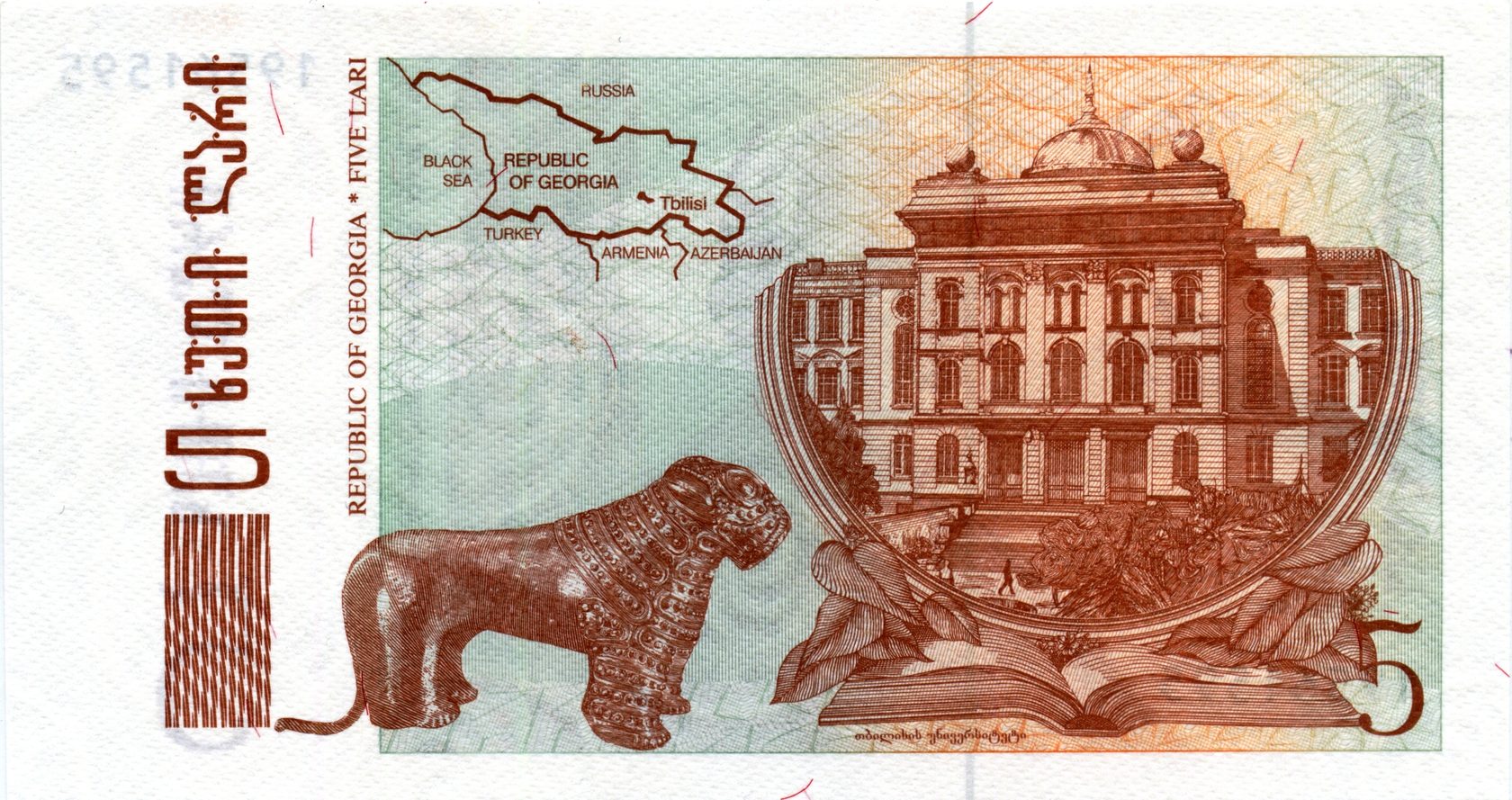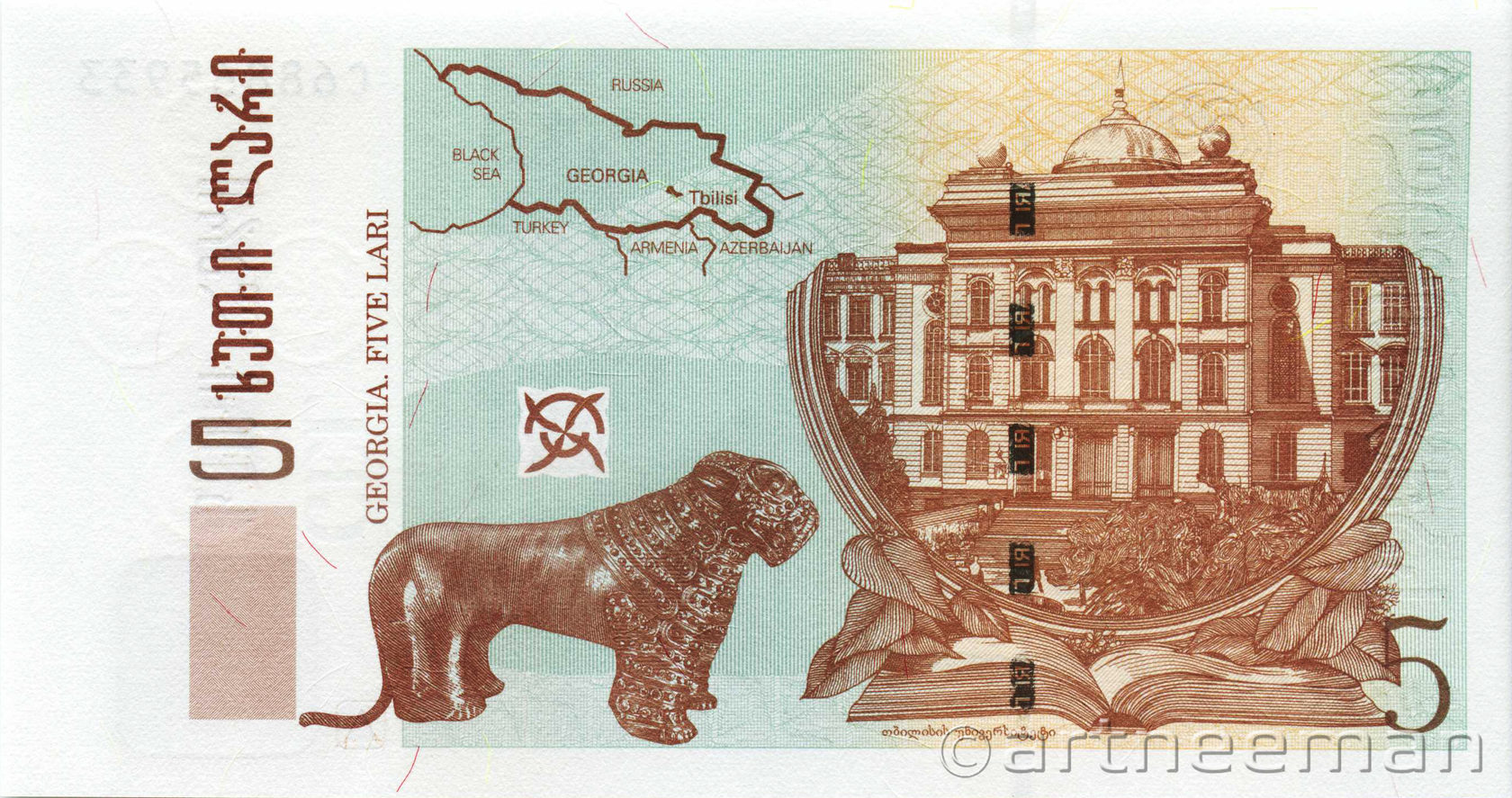 Оборотная сторона: Здание Тбилисского государственного университета им. Иванэ Джавахишвили; золотая скульптура льва III тыс. до н. э.; карта Грузии.
