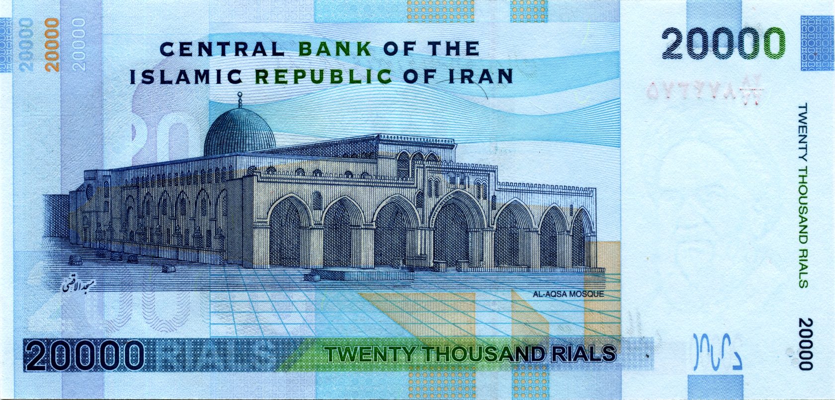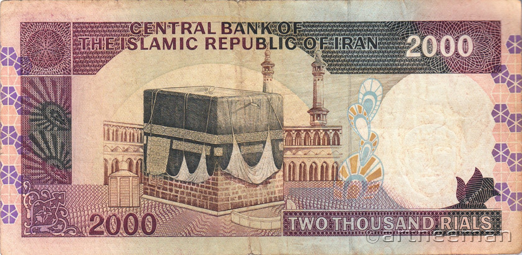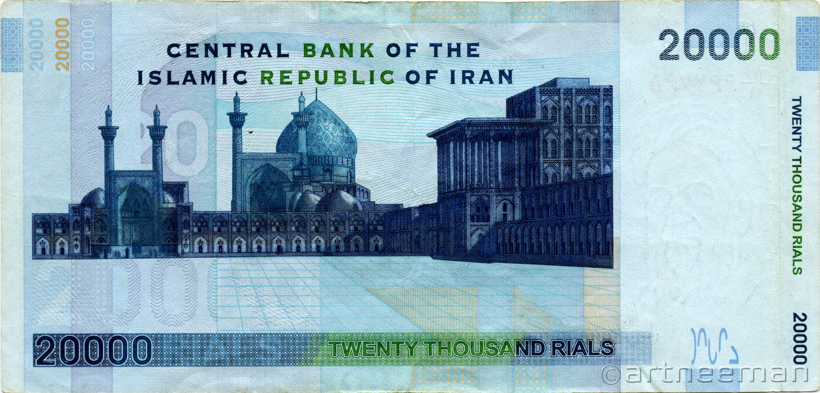 Оборотная сторона: Мечеть Имама (перс. مسجد امام — masjed-e emam), бывш. Мечеть Шаха — крупнейшая мечеть Исфахана, расположенная с южной стороны Площади Имама. Строительство начато в 1611 году, окончено — в 1641 году. Пло́щадь На́кш-э Джаха́н (перс. میدان نقش جهان / Maydâne Naqše Jahân) Площадь Имама — крупная площадь в иранском городе Исфахан, один из объектов Всемирного наследия ЮНЕСКО в Иране. Площадь построена между 1598 и 1629 годом. Ее ширина составляет 160 метров, длина — 560 метров (площадь 89 600 квадратных метров). Площадь окружена зданиями эпохи Сефевидов.