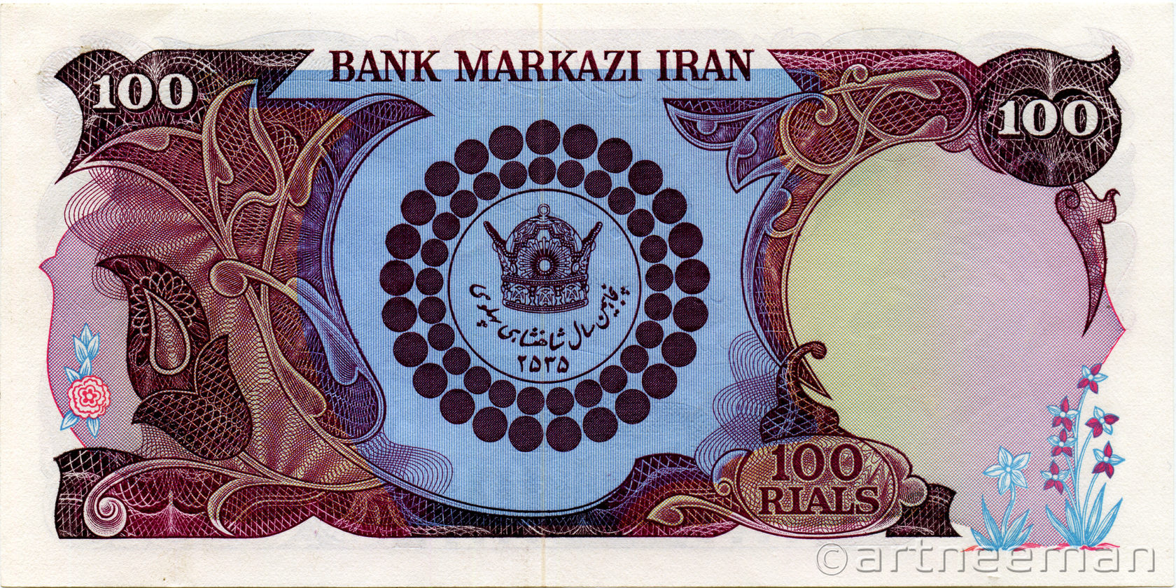 Лицевая сторона: Портрет (7-й тип) Императора Ирана - Мохаммед Реза Пехлеви (26 октября 1919 - 27 июля 1980 года) в военной форме. Персидские цветочные узоры.